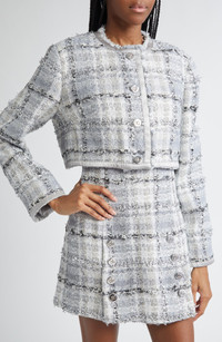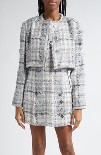 Logo buttons and satin trim deliver polished finishing touches to this cropped jacket tailored from richly textured tweed patterned in tonal checks. Front button closure Jewel neck Lined 26% rayon, 18% wool, 15% nylon, 13% acrylic, 11% metallic fibers, 9% polyester, 8% silk Dry clean Made in Italy Designer Clothing