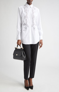 Part of the maison's DNA Collection, this crisp poplin shirt incorporates classic D&G codes with inset panels of exquisite Italian needle lace, revealing peekaboo flashes of skin. Front button closure Point collar Long sleeves with button cuffs 92% cotton, 6% nylon, 2% spandex Dry clean Made in Italy Designer Clothing