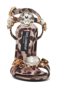 This quarter-strap sandal in leopard-print satin features large crystals that add statement-scale sparkle to the minimalist silhouette. Gleaming DG hardware on the bold block heel provides a signature flash. Adjustable ankle strap with buckle closure Textile upper/leather lining and sole Made in Italy Designer Shoes