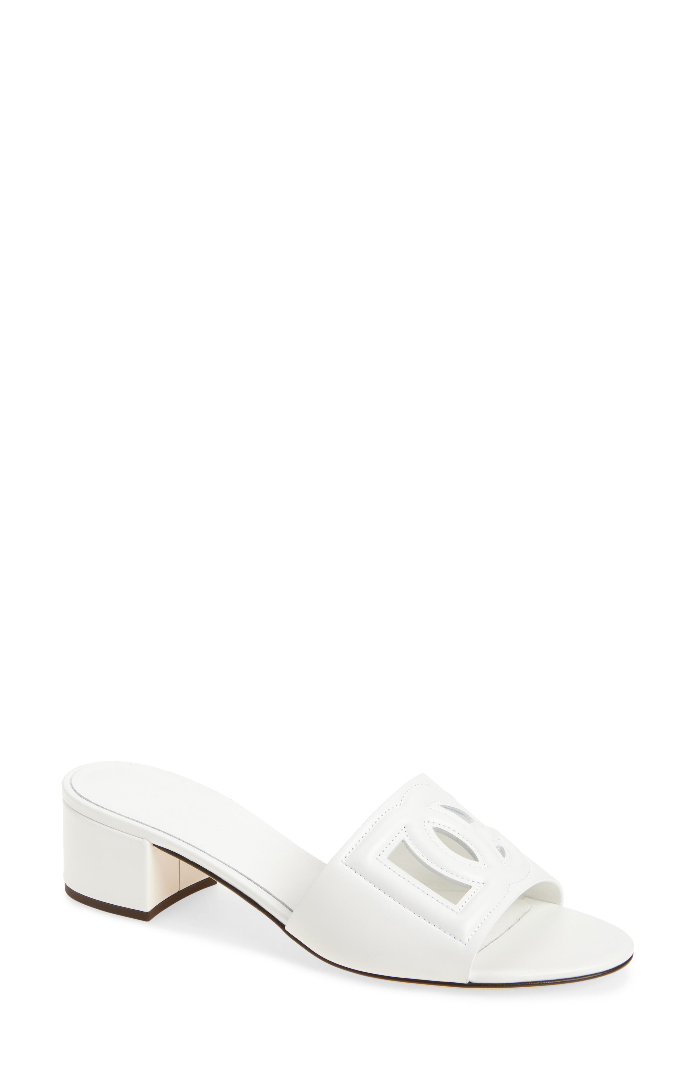 The label's signature DG Millennials logo brings 3D-embossed branding to a minimalist slide sandal lifted by a comfortably low block heel. 1 1/2" heel Leather upper, lining and sole Made in Italy Designer Shoes