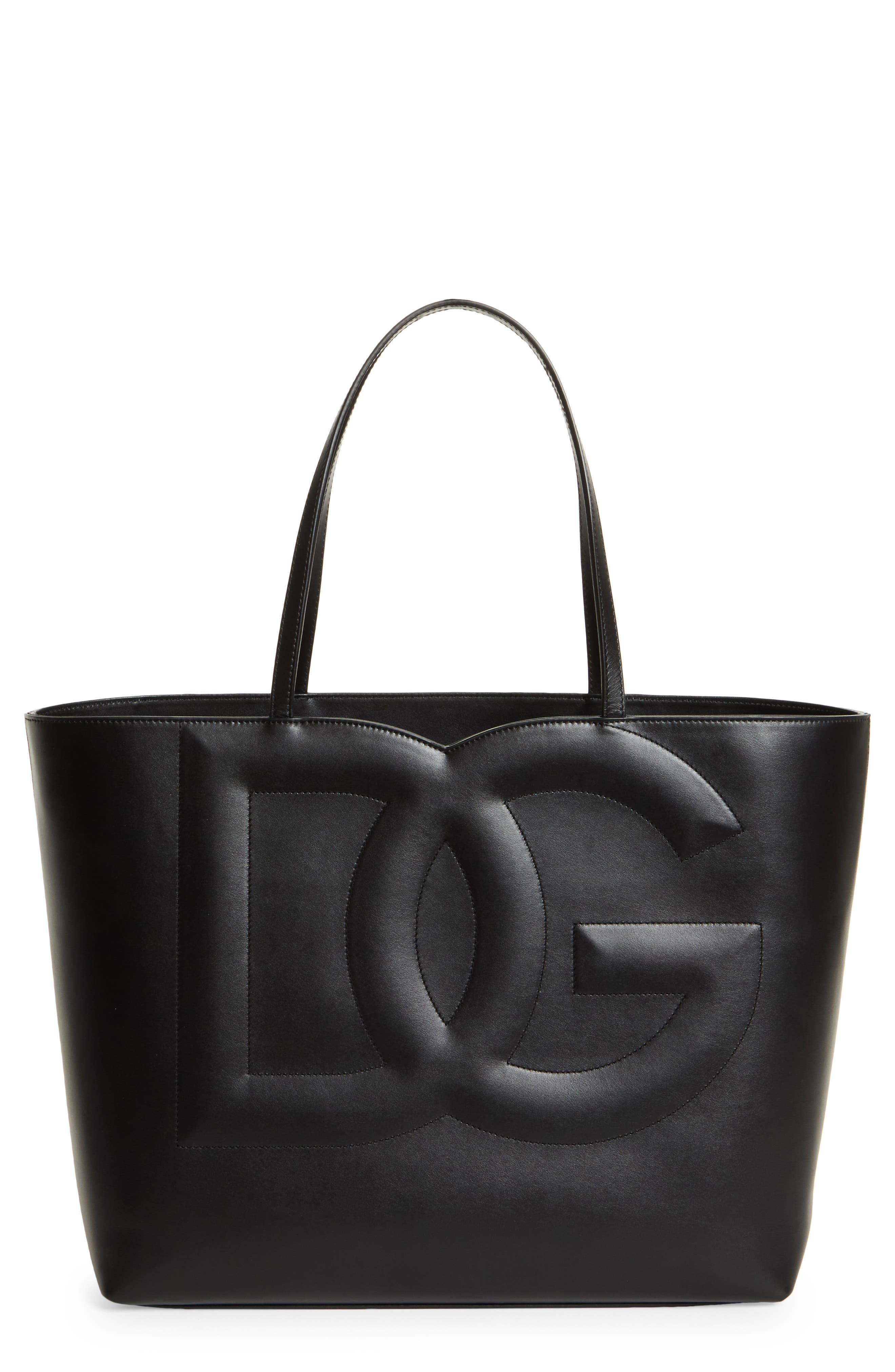An oversized interlocking DG logo takes center stage on this spacious tote crafted of smooth calfskin leather and topped with slim handles. Open top Top carry handles Interior zip pocket Logo-jacquard lining Leather Made in Italy Designer Handbags