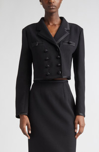 The label's Spring/Summer '25 collection draws inspiration from traditional lingerie of the 1950s, as evidenced with this runway-featured crop jacket traced with sultry silk-kissed satin. Double-breasted button closure Notched lapels Button cuffs Chest button-welt pockets 83% virgin wool, 11% silk, 3% polyester, 2% polyamide, 1% spandex Dry clean Made in Italy Designer Clothing