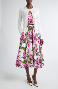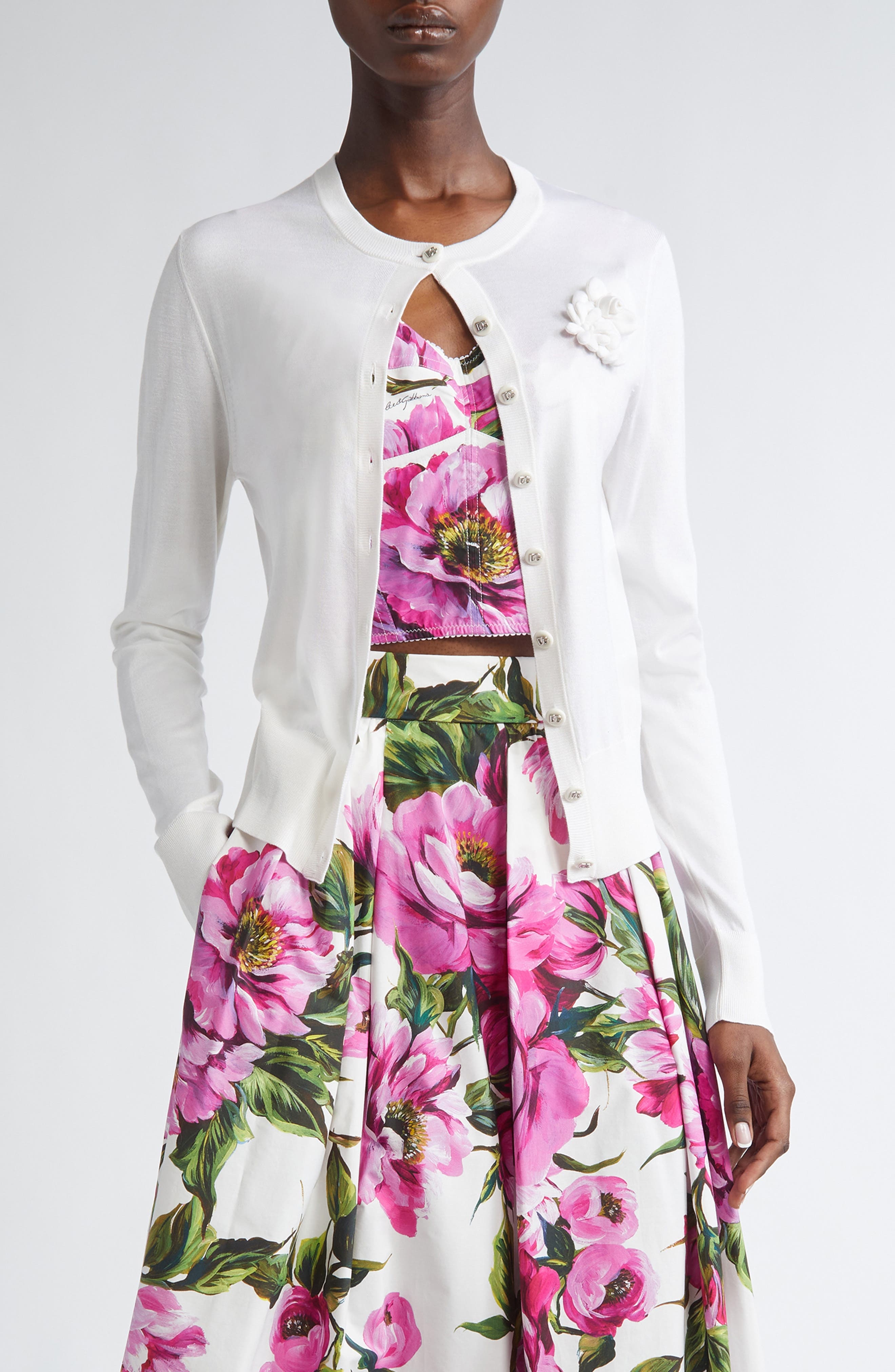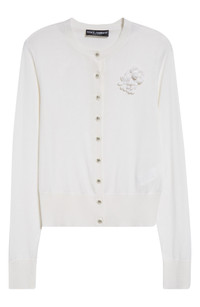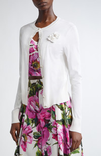 Dolce&Gabbana Floral Appliqué Silk Crewneck Cardigan in Bianco Ottico at Nordstrom