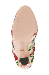 The Italian label's perennial flora fascination springs forth on this satin pump elevated by a hidden platform and lofty, sculpted heel. The retro vibes continue with a trio of bow-trimmed straps that start at the ankle and end above the rounded toe, with a mary jane strap in between. 4" (105mm) heel Adjustable ankle strap with buckle closure Textile and leather upper and lining/leather and rubber sole Made in Italy Designer Shoes