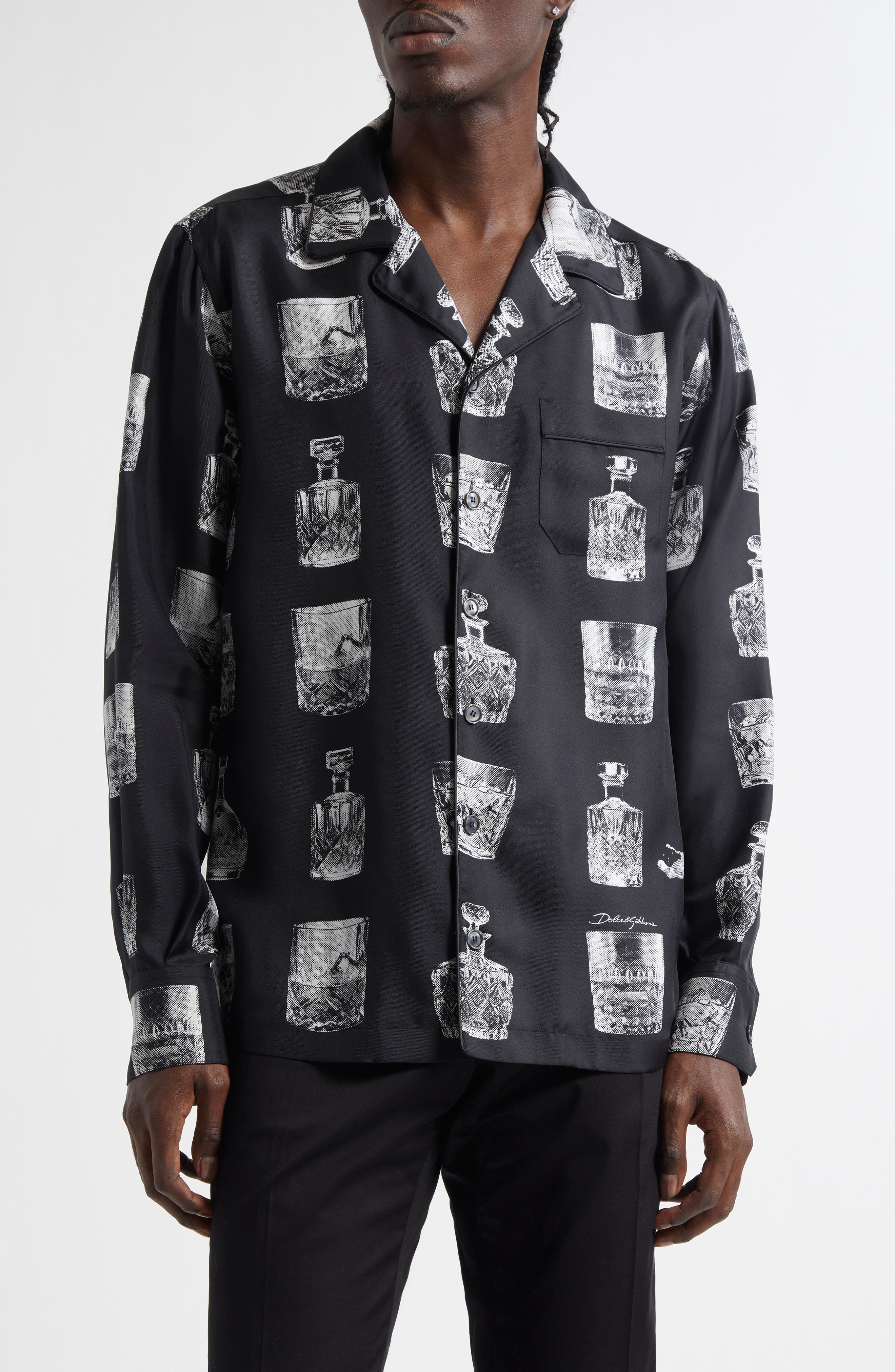 Dolce&Gabbana Liquor Print Silk Twill Camp Shirt in Hn5Ia Liquori Fdo Nero at Nordstrom