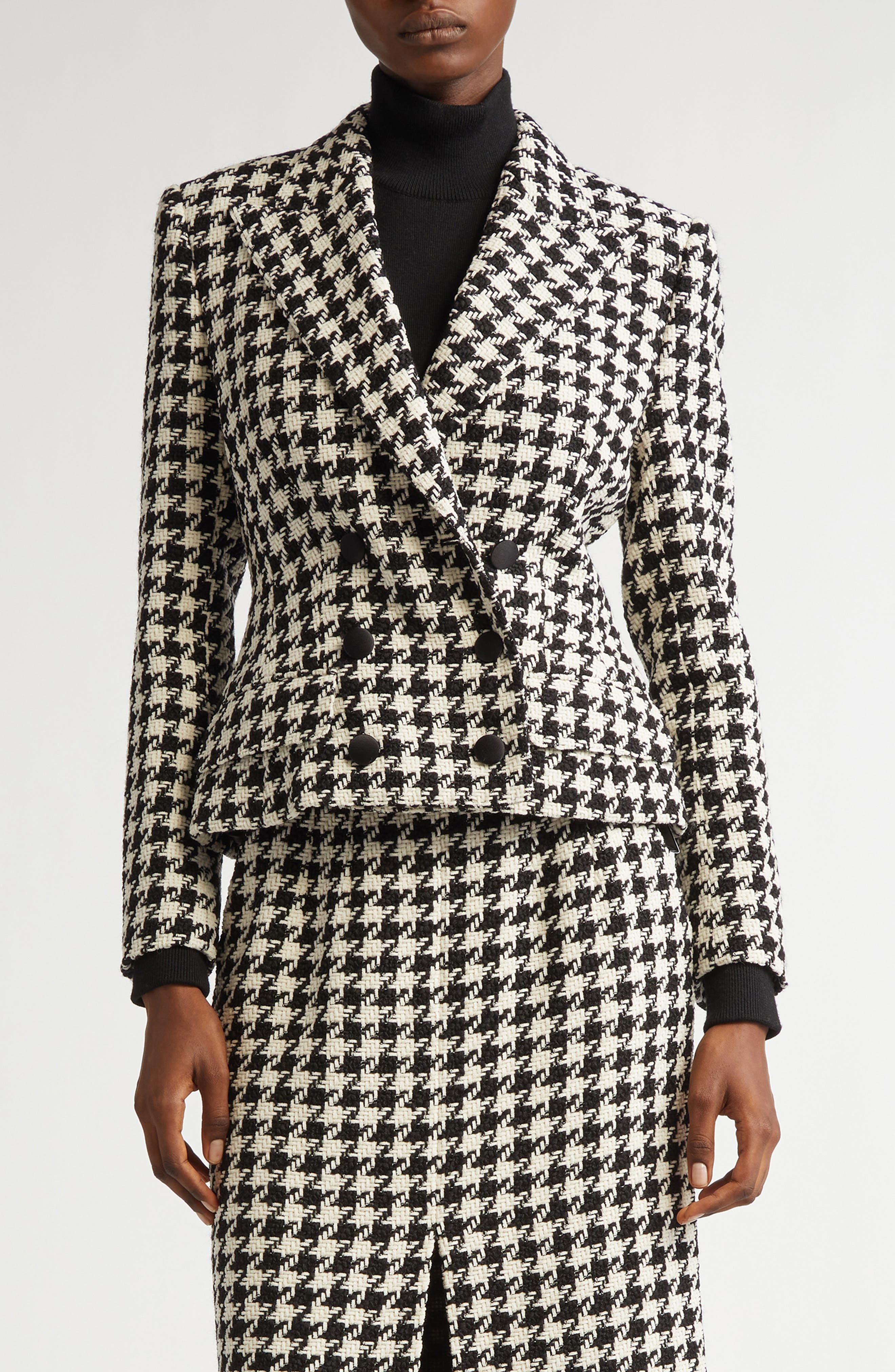 Macro-houndstooth woven in a check pattern bring a bold graphic effect to this double-breasted blazer tailored from a wool-and-cotton tweed. Double-breasted button closure Peaked lapels Four-button cuffs Front flap pockets Silk lining 65% virgin wool, 35% cotton Dry clean Made in Italy Designer Clothing
