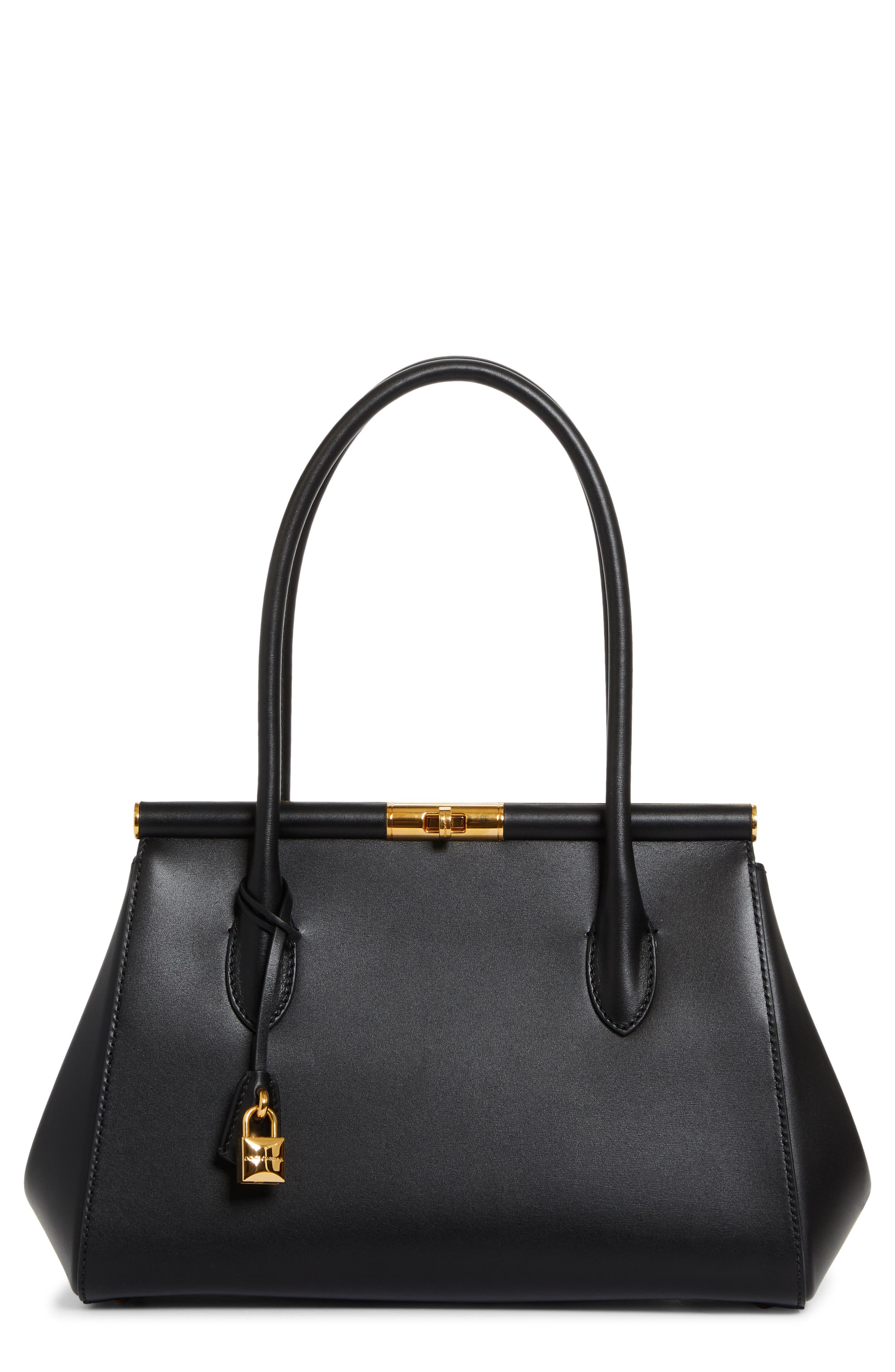 D&G's timeless Marlene bag gets reimagined as a frame satchel that's crafted in a scaled-down structured silhouette from palmellato calfskin leather. It also comes with removable padlock that secures the turnlock closure—a hallmark of the line. Turnlock frame closure Top carry handles; removable chain strap Removable padlock Structured silhouette with flat base and protective metal feet Leather Made in Italy Designer Handbags