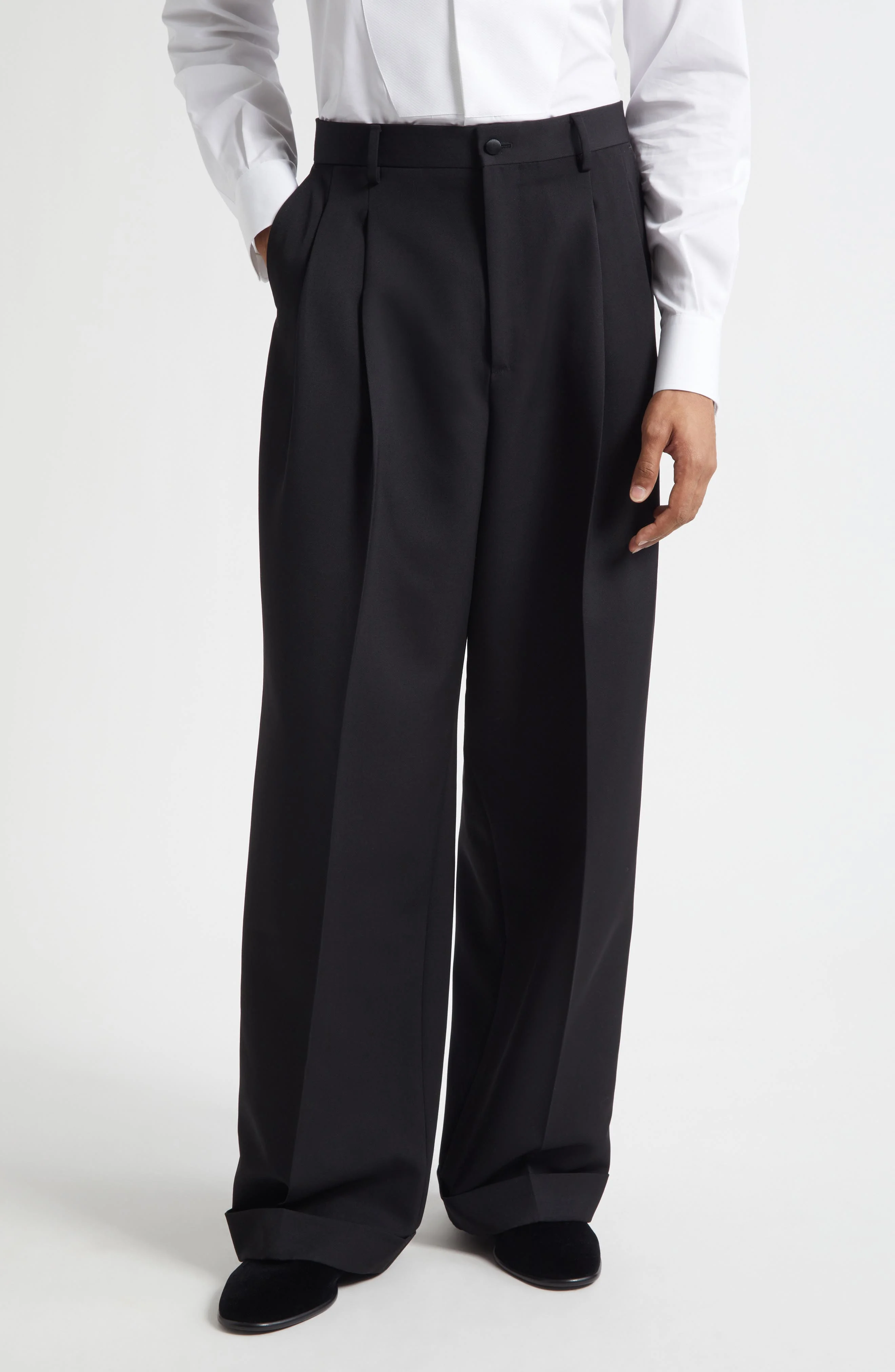 Dolce&Gabbana Pleated Wool & Silk Blend Gabardine Wide Leg Tuxedo Trousers in N0000 Nero at Nordstro