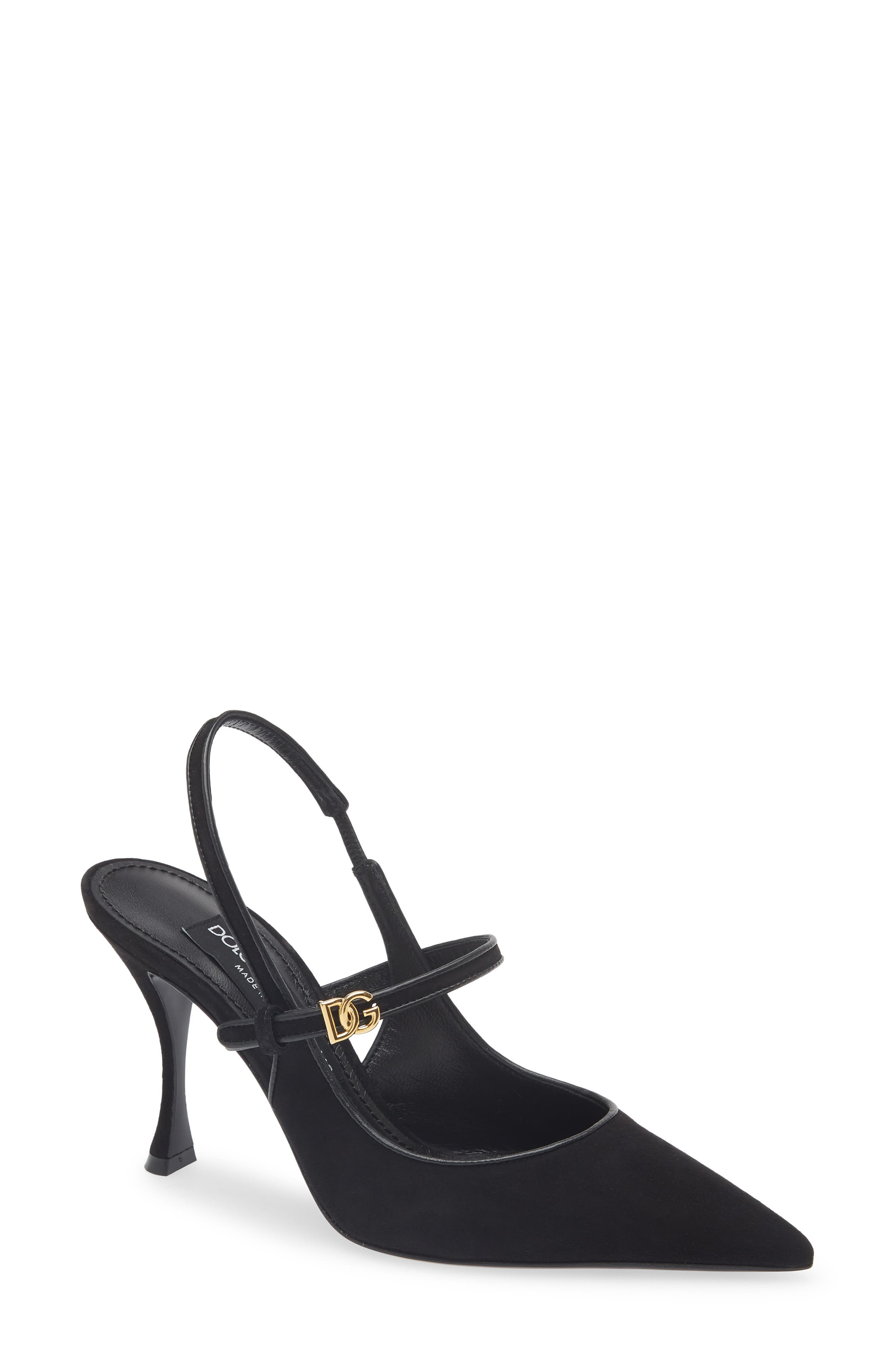 DG's interlocking logo shines at the mary-jane strap of this goatskin-suede pump sharpened with a pointy toe and sculptural heel. 3 1/2" (89mm) heel Adjustable strap with buckle closure; elasticized slingback strap Leather upper, lining and sole Made in Italy Designer Shoes
