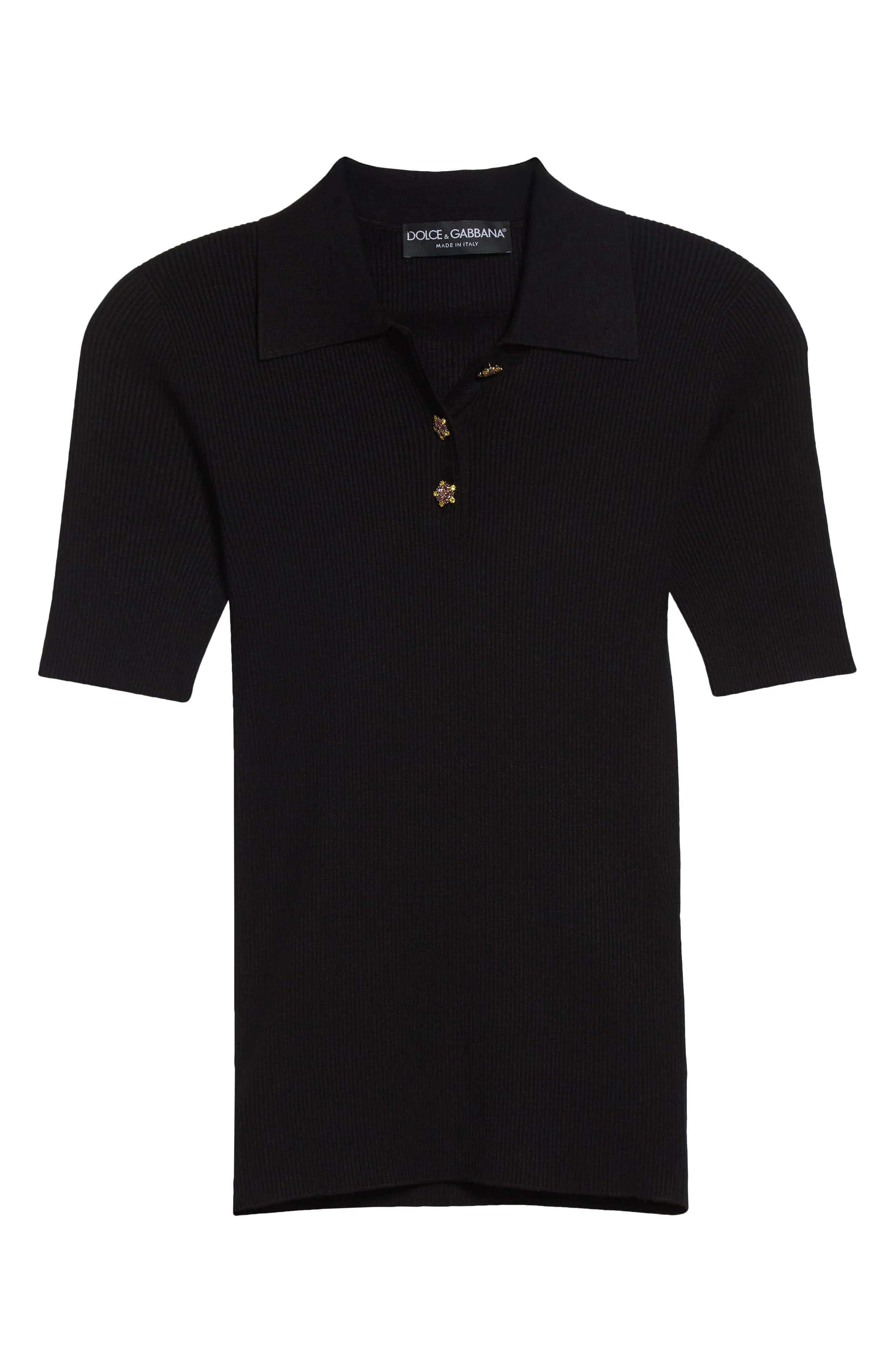 Jeweled flower-shaped buttons beguilingly brighten the half placket of this rib polo sweater ready to take up its staple status in your casual wardrobe. Button half placket Spread collar Elbow-length sleeves 72% viscose, 28% polyester Dry clean Made in Italy Designer Clothing