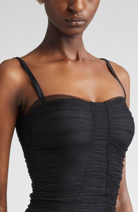 Extrastretchy ruched tulle lends itself well to the body-con styling of this LBD in the voluptuous mold of Italian film femme fatales of the '50s and '60s. Slips on over head Sweetheart neck Stretch-silk lining 89% nylon, 11% spandex Dry clean Made in Italy Designer Clothing