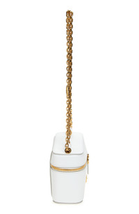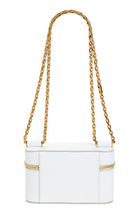 The infamous Italian fashion house draws inspiration from the structured silhouettes of vintage vanity cases with this boxy bag crafted from smooth calfskin leather. It even features a mirror on the inside for on-the-go beauty touch-ups. Two-way top zip-around closure Pull-through chain strap Interior elastic storage strap; mirrored logo on lid Structured silhouette with flat base and protective metal feet Napa-leather lining Leather Made in Italy Designer Handbags