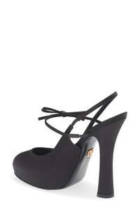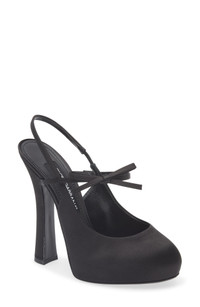 This satin slingback pump lifted by a sky-high heel and platform is inspired by Old Hollywood glamour and was featured in the opening look of the label's 'Italian Beauty' runway. A rounded toe and a prim bow detailing the mary jane strap add elements of retro pin-up allure. 4" (105mm) heel Elasticized slingback strap Textile upper/leather and textile lining/leather sole Made in Italy Designer Shoes
