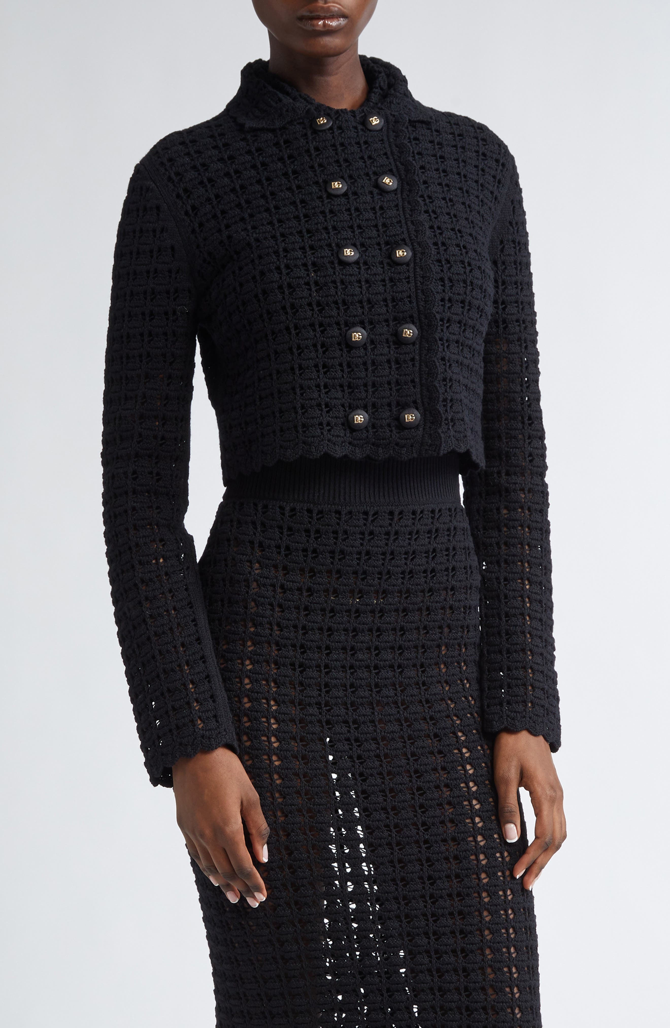 Logo-embellished buttons put D&G's signature stamp on this double-breasted cropped jacket crocheted from soft virgin wool. Double-breasted button closure Spread collar 100% virgin wool Dry clean Made in Italy Designer Clothing