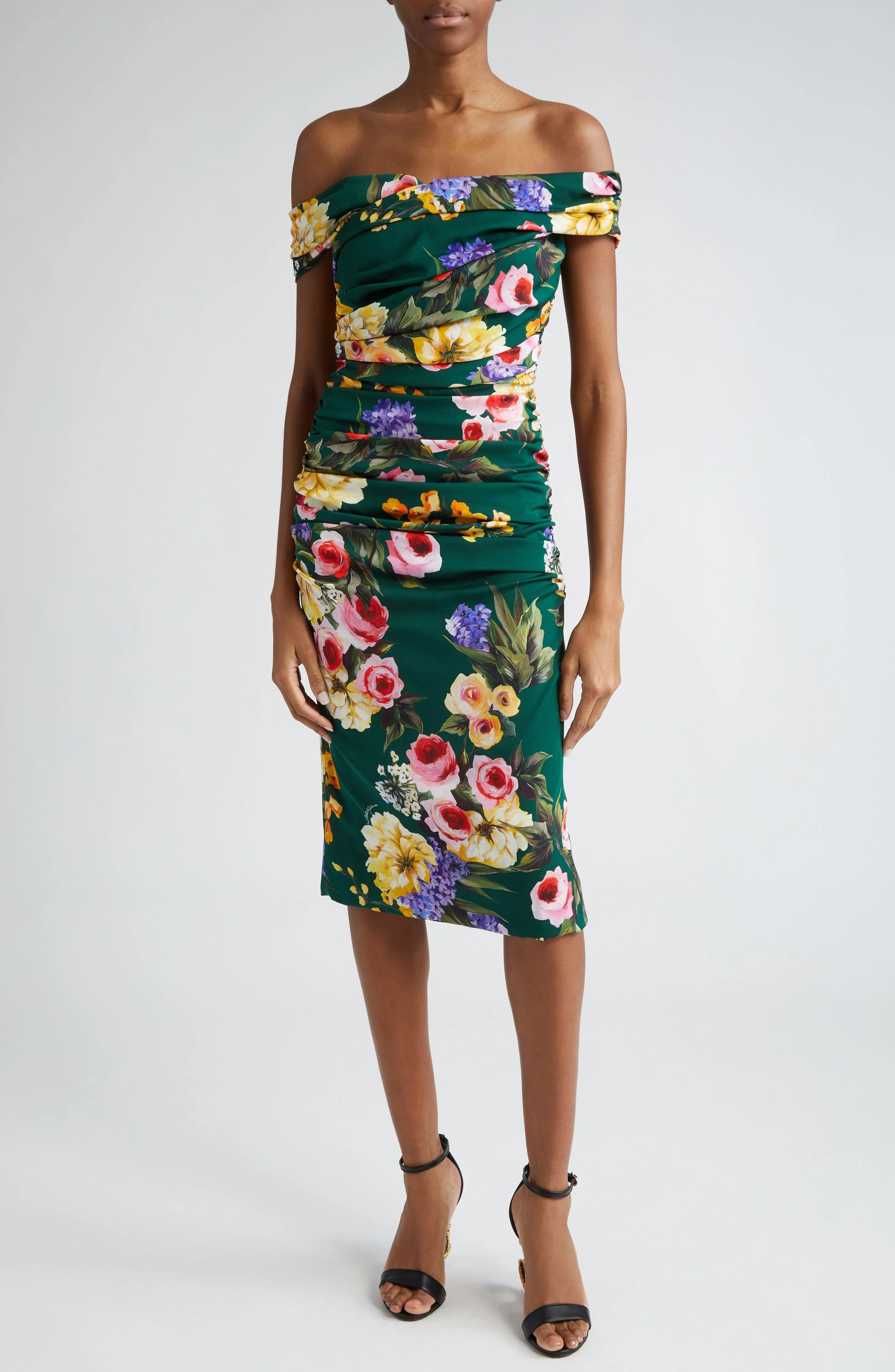 Charmeuse draped sheath dress with garden print