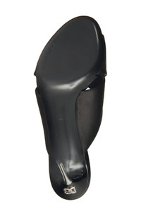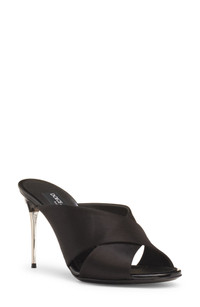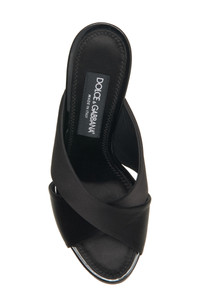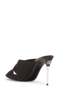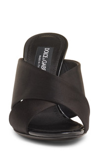 A metal setback heel topped with a gleaming DG logo adds seductive height to this Italian-made slide sandal secured by wide, crisscrossing satin straps. 3 1/4" (85mm) heel Textile upper/leather lining and sole Made in Italy Designer Shoes