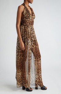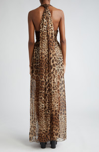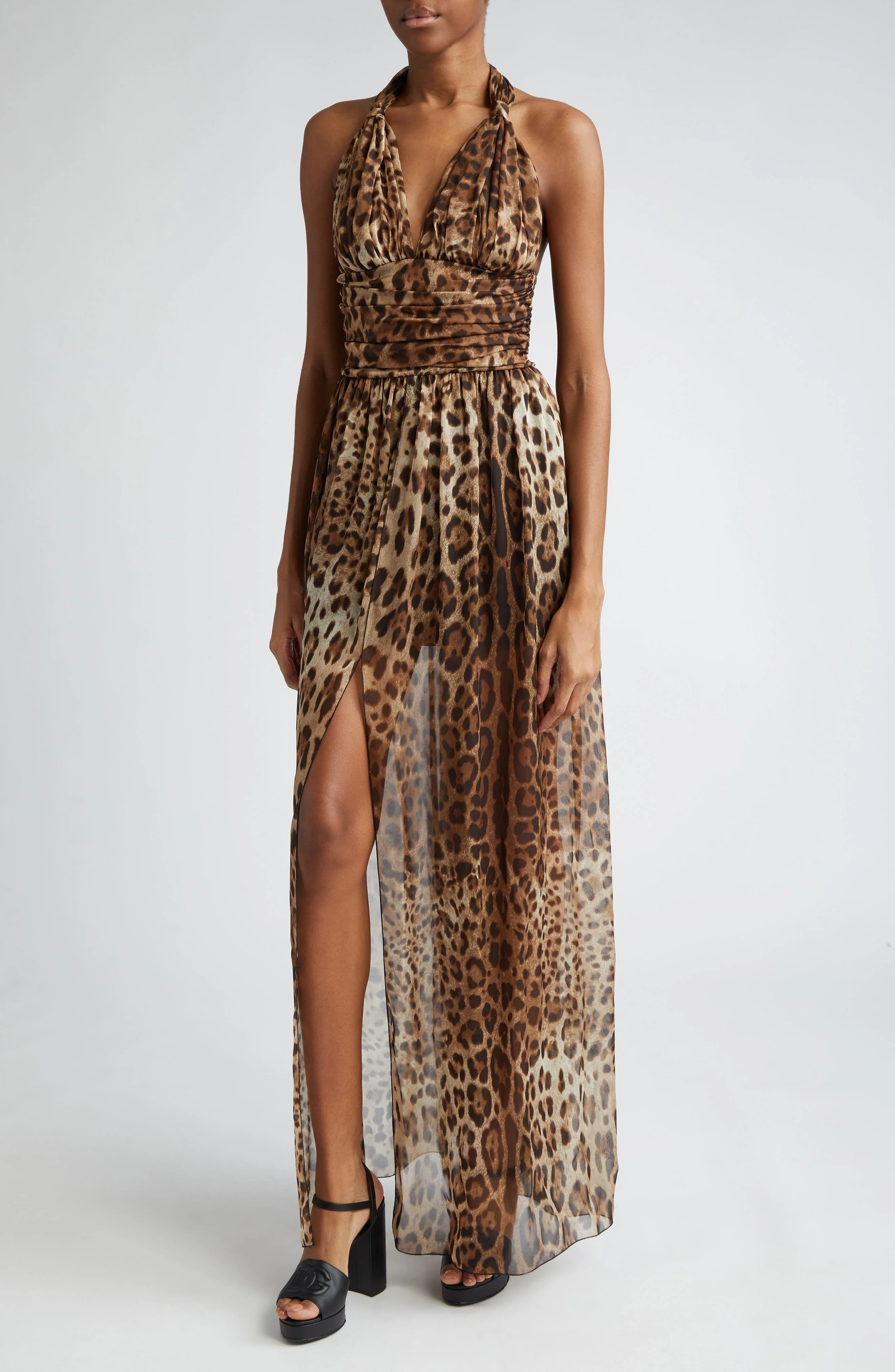 Leopard spots elevate the fierce appeal of this runway-featured silk maxi that showcases ruching at the waist, a soaring front slit and extended halter straps. Halter neck Smocked back Front slit 100% silk Dry clean Made in Italy Designer Clothing