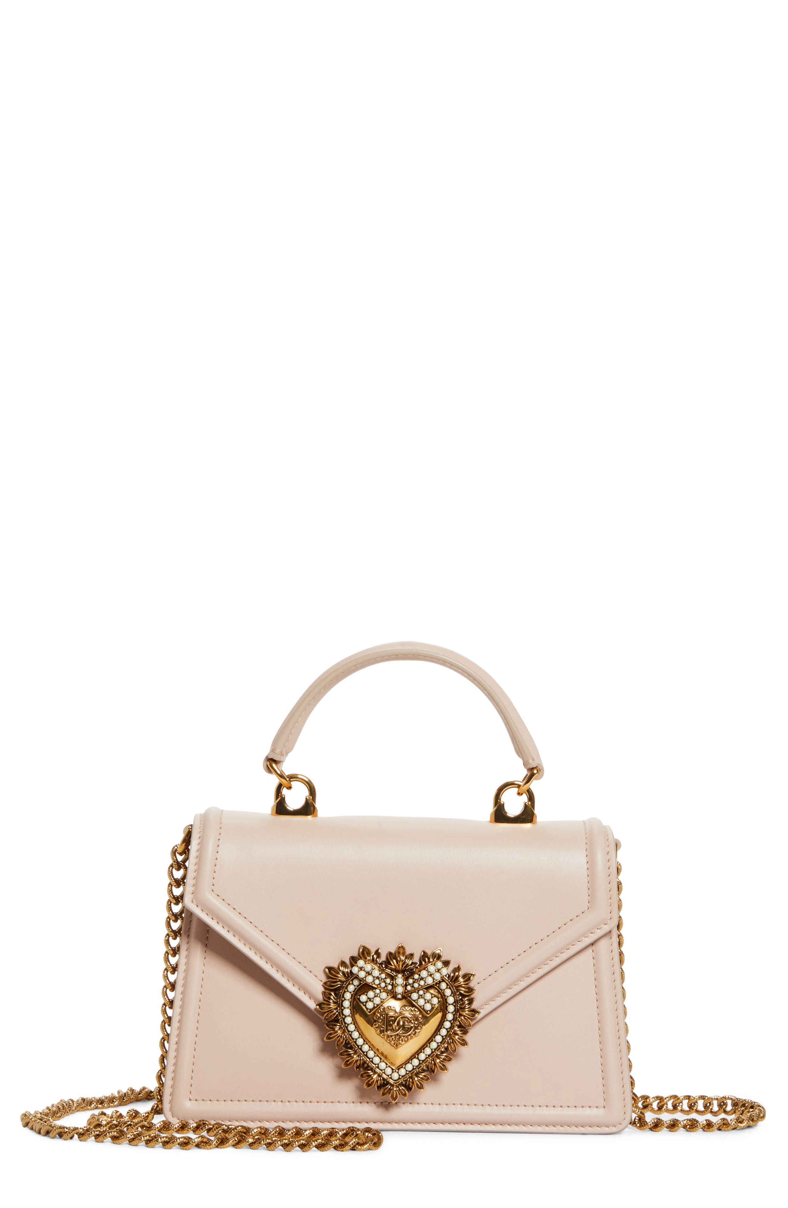 A symbol of unconditional love and faith, a hand-tooled sacred heart bejeweled with pearly inlays beautifully shines on this sized-down calfskin bag. Remove the jewelry-inspired chain strap and carry the structured look by the top handle. Snap-flap closure Top carry handle; removable chain strap Interior wall pocket Structured silhouette with level base for stability Leather lining Leather Made in Italy Designer Handbags