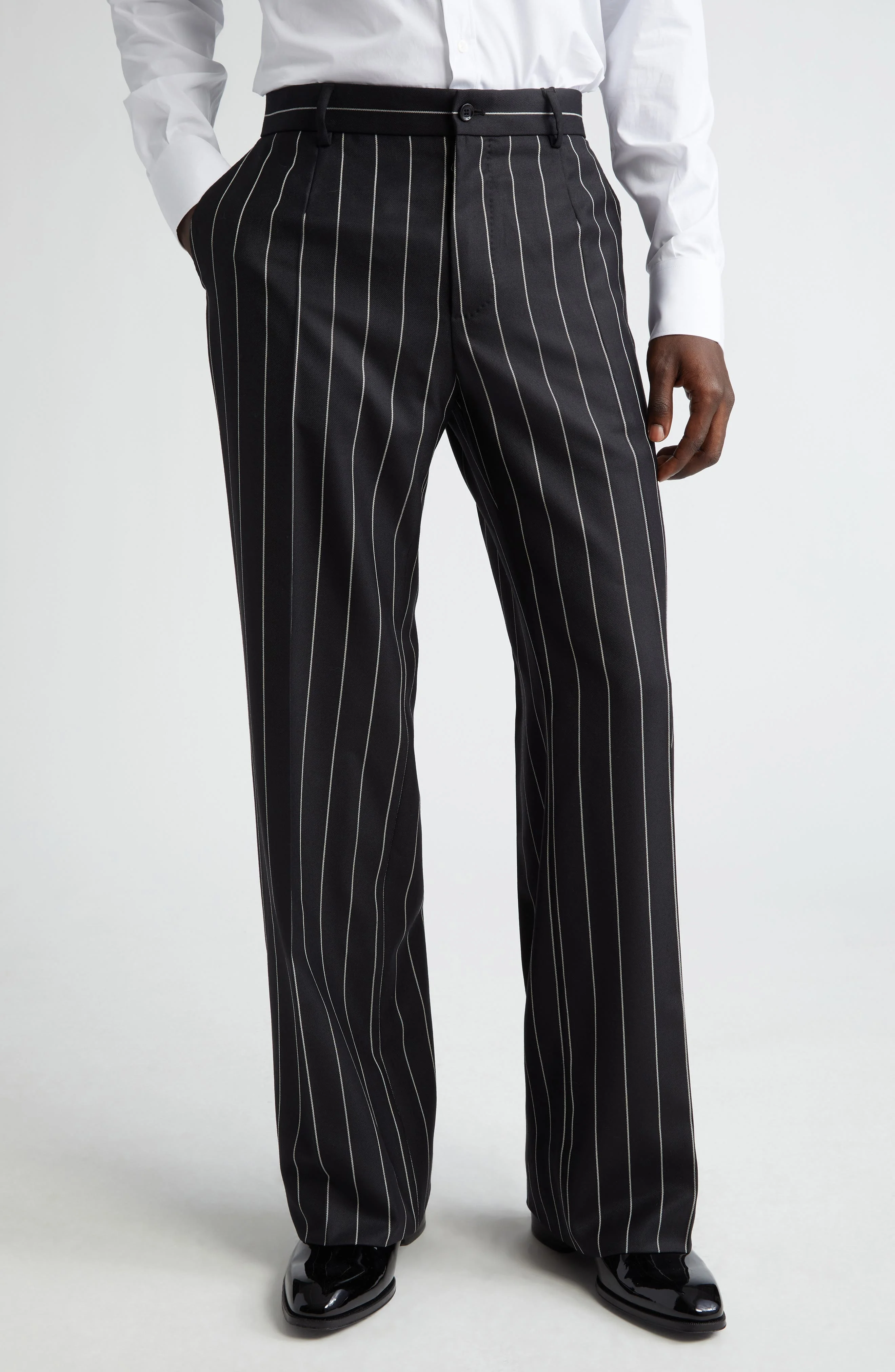 Polished pinstripes bring this season's pared-down precision to runway-featured trousers tailored in Italy from pure wool. Zip fly with button closure Front slant pockets; back button-welt pockets 100% wool Dry clean Made in Italy Designer Clothing