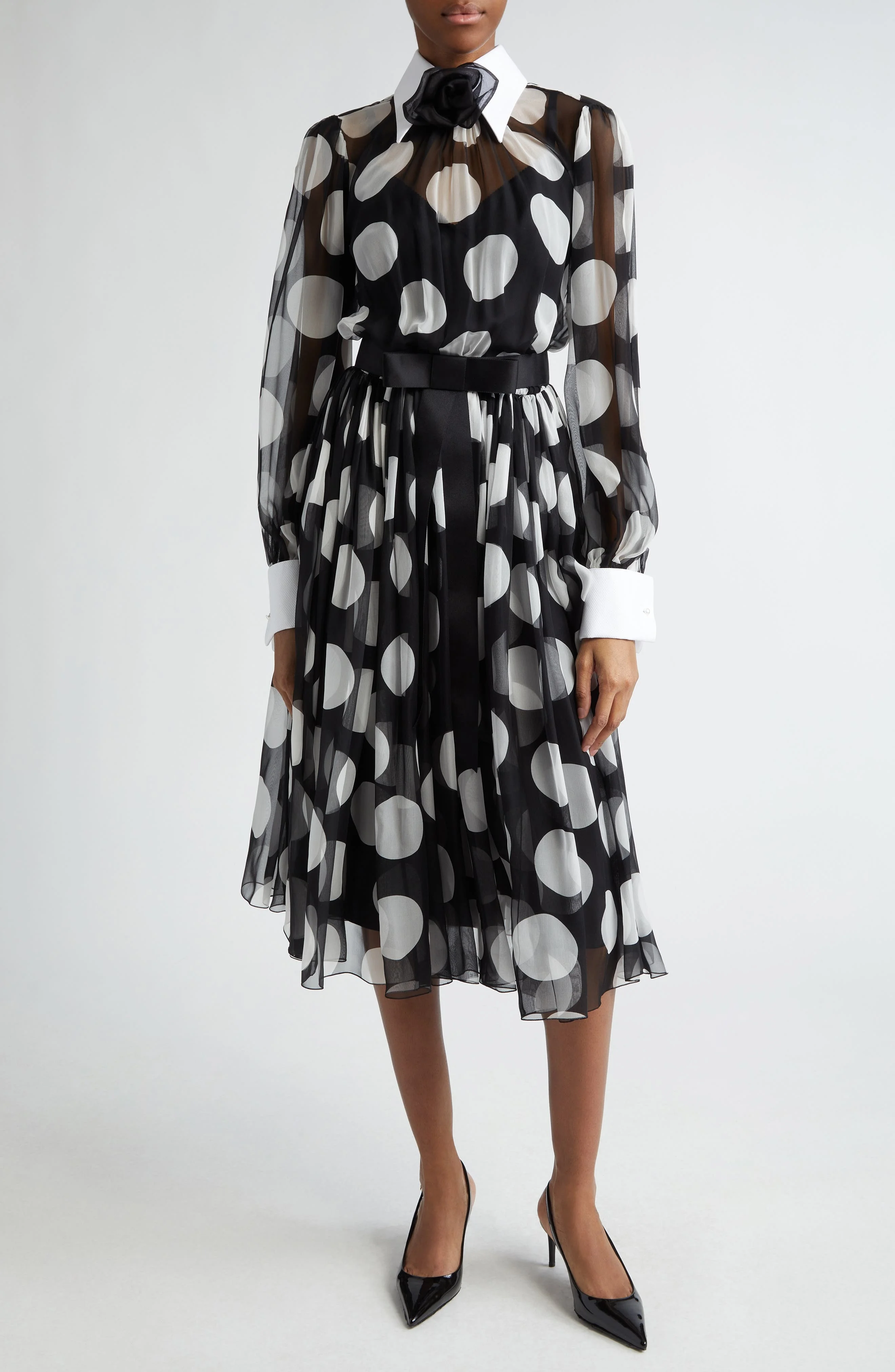 Polka Dot Long Sleeve Belted Chiffon Midi Dress