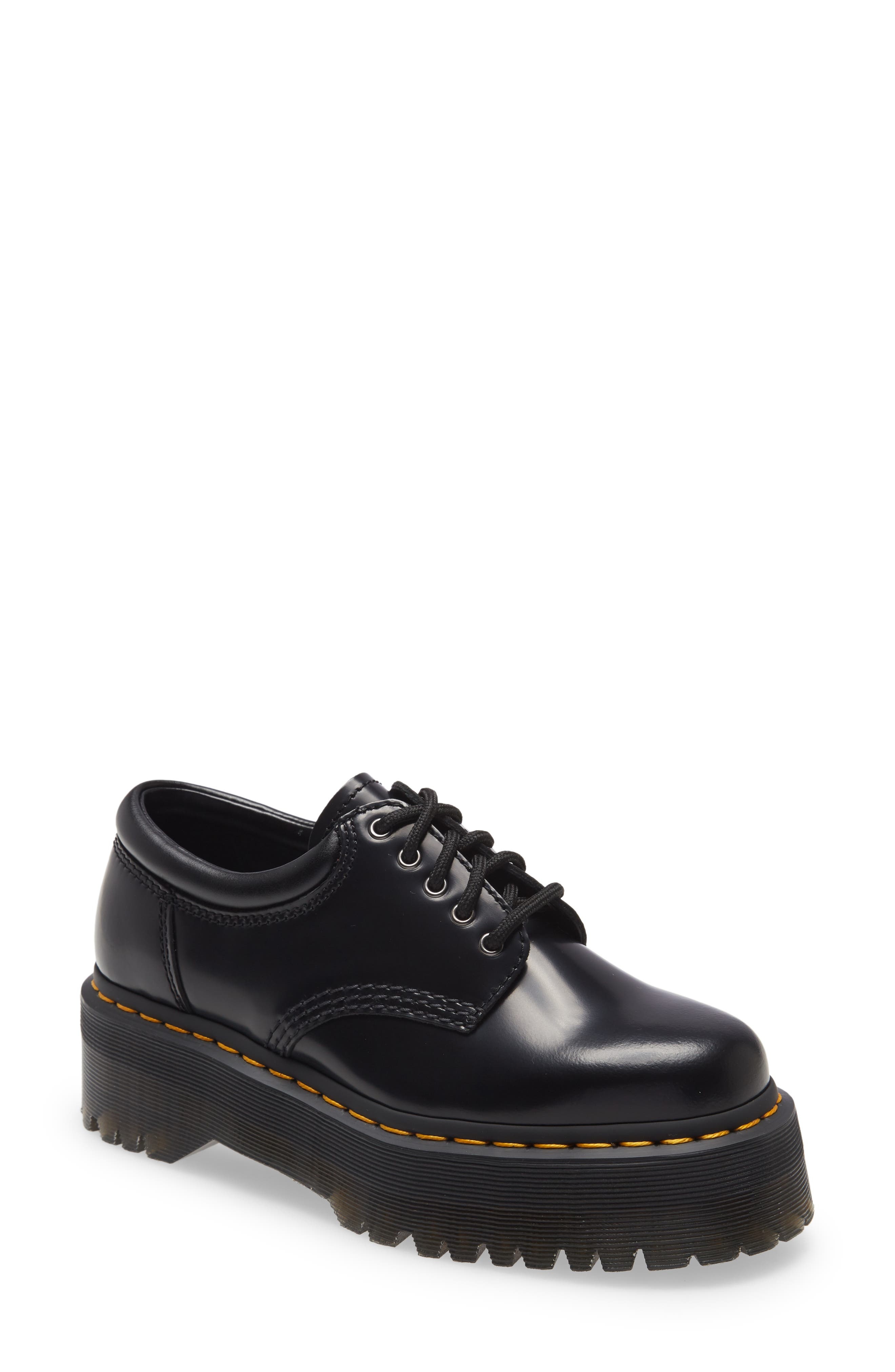 Contrast stitching calls attention to the bold platform sole of a burnished derby that's an iconic workwear essential. 2" heel; 1 1/2" platform (size 7UK) Lace-up style Removable insole Leather and synthetic upper/textile and synthetic lining/synthetic sole Imported Women's Shoes
