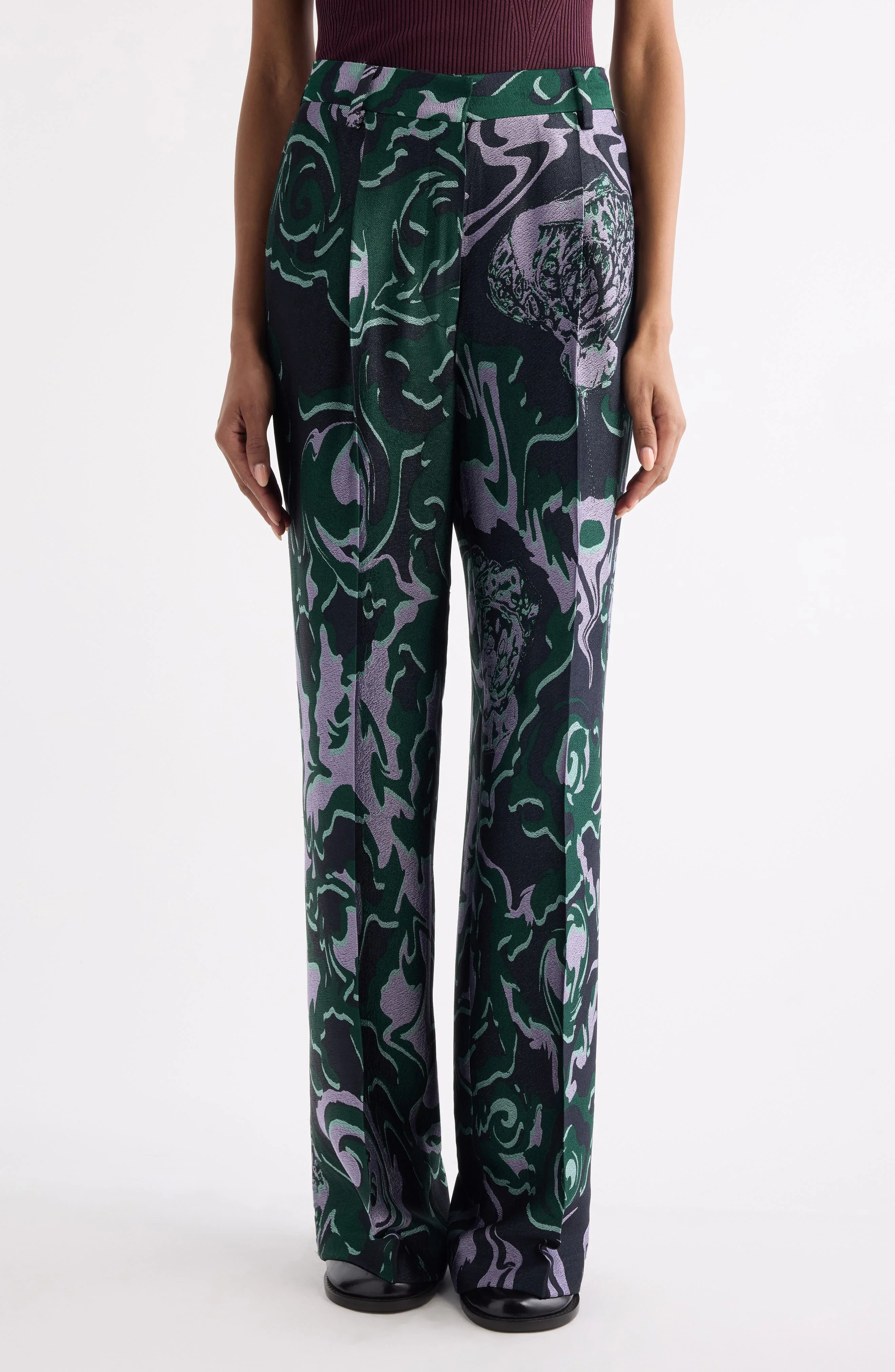 Van Noten successor Julian Klausner continues the iconoclastic Belgian designer's bold color/print/texture fusion with these pleated crepe pants in an abstract floral-jacquard pattern that captures the tonal richness of the winter '25 collection. Zip fly with hook-and-bar closure Side-seam pockets; back welt pockets 78% viscose, 22% cotton Dry clean Imported Designer Clothing