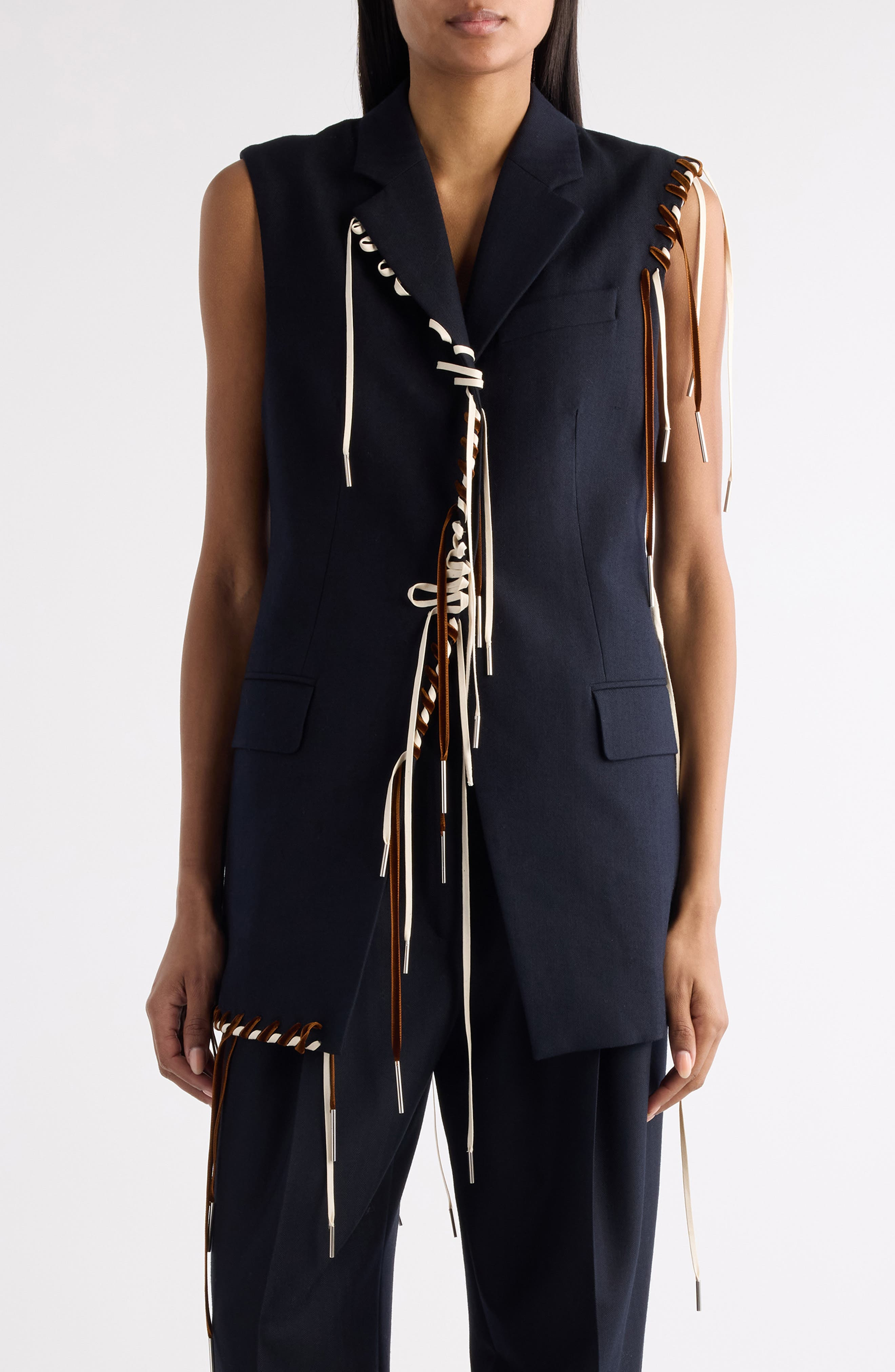 A mix of whipstiching and laced details—recurring motifs seen on Julian Klausner's debut collection for the Belgian label—stands out on this wool herringbone blazer updated with a sleeveless design. Hidden-button placket Notched lapels Sleeveless Chest welt pocket; front flap pockets Lined 100% wool Dry clean Imported Designer Clothing