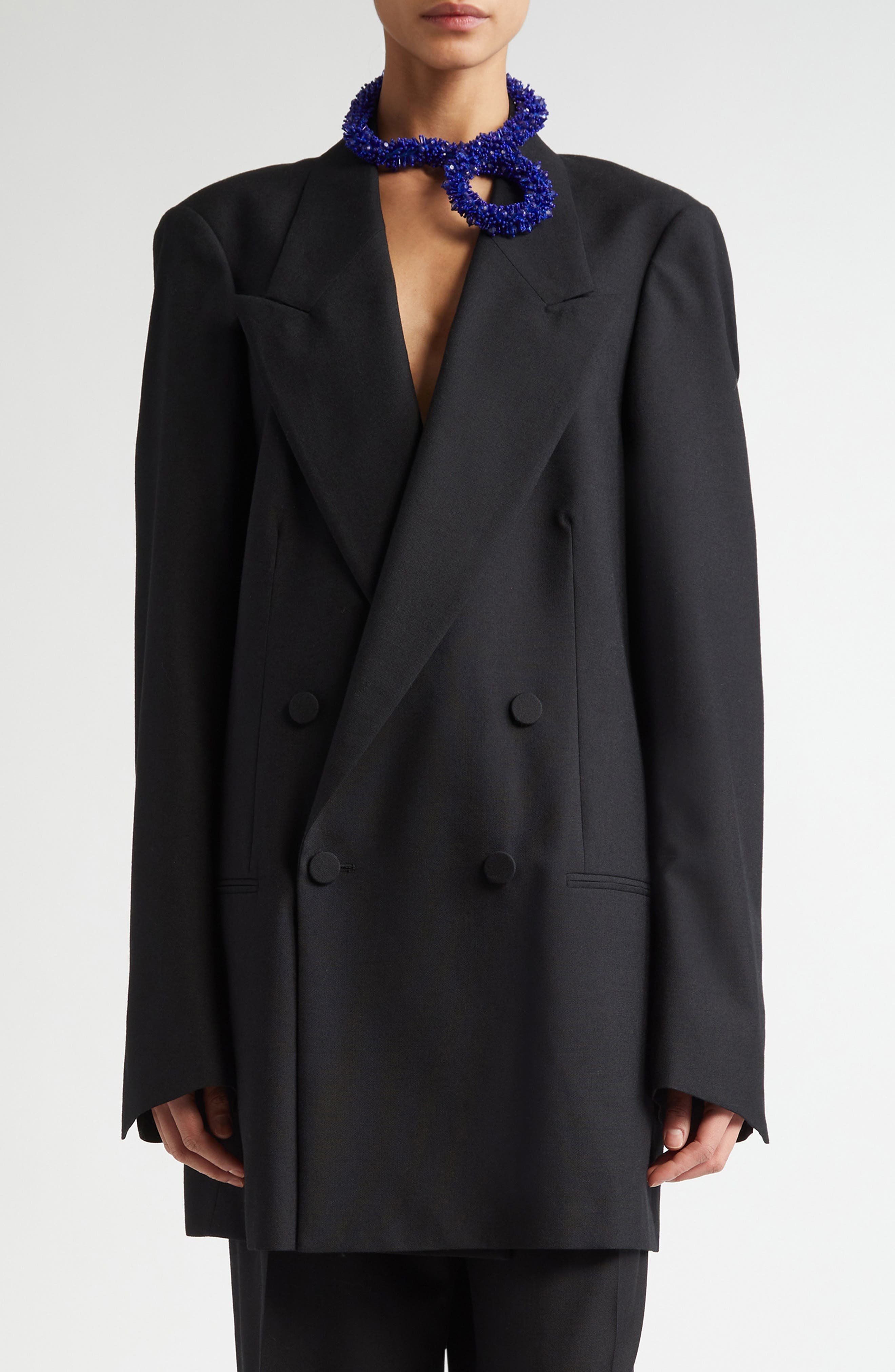 The Belgian designer's silhouette du jour—oversized, double-breasted, peaked-lapels—is rendered in wool toile and was featured on the fall '24 runway. Double-breasted button closure Peaked lapels Split cuffs Front welt pockets Lined 100% wool Dry clean Imported Designer Clothing