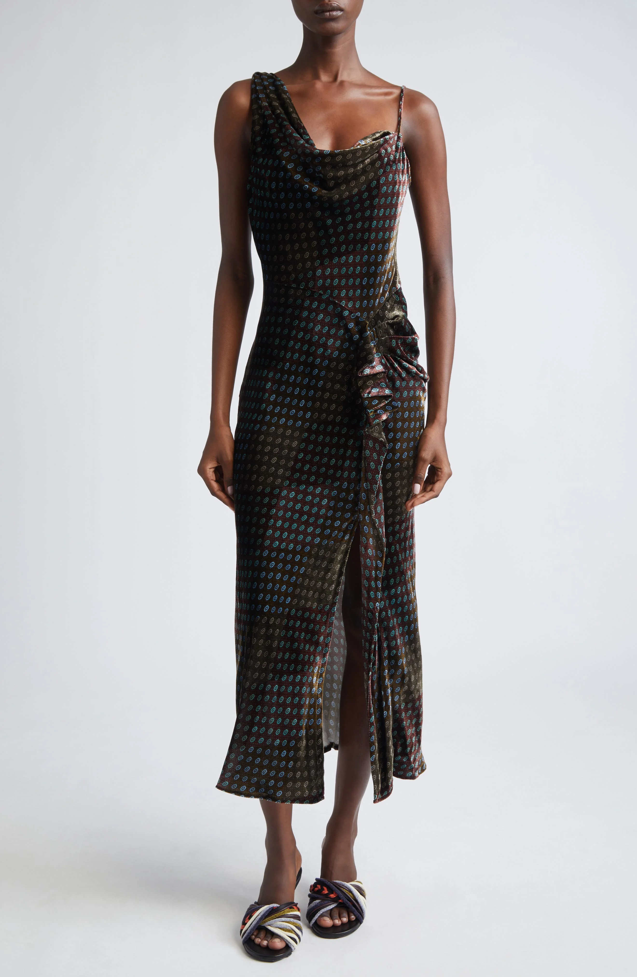 Van Noten successor Julian Klausner continues the iconoclastic Belgian designer's eclectic color/print/texture fusion in this silk-enriched velvet dress patterned in polka dots and retro medallions reminiscent of vintage ties—a repeated motif for fall '25. Artful draping gives way to a sultry side slit, revealing peekaboo glimpses of skin as you walk. Asymmetric cowl neck Adjustable strap Side slit 82% viscose, 18% silk Dry clean Imported Designer Clothing