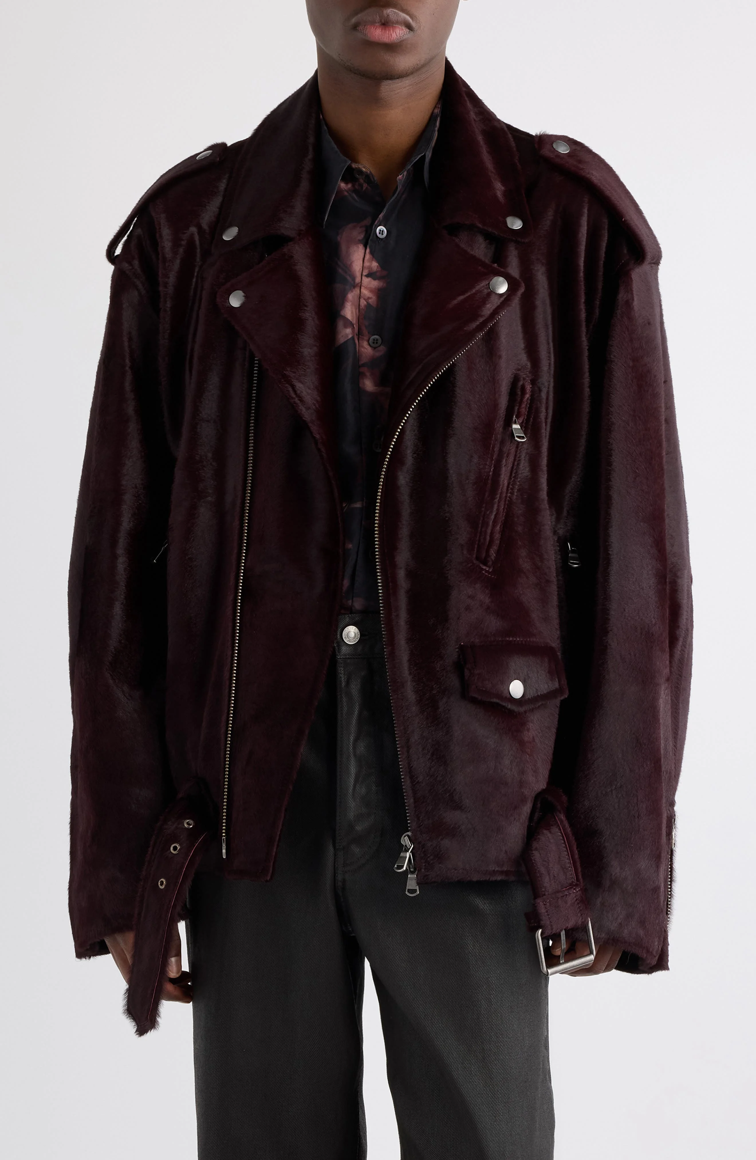 Dries Van Noten Genuine Calf Hair Biker Jacket in Burgundy at Nordstrom