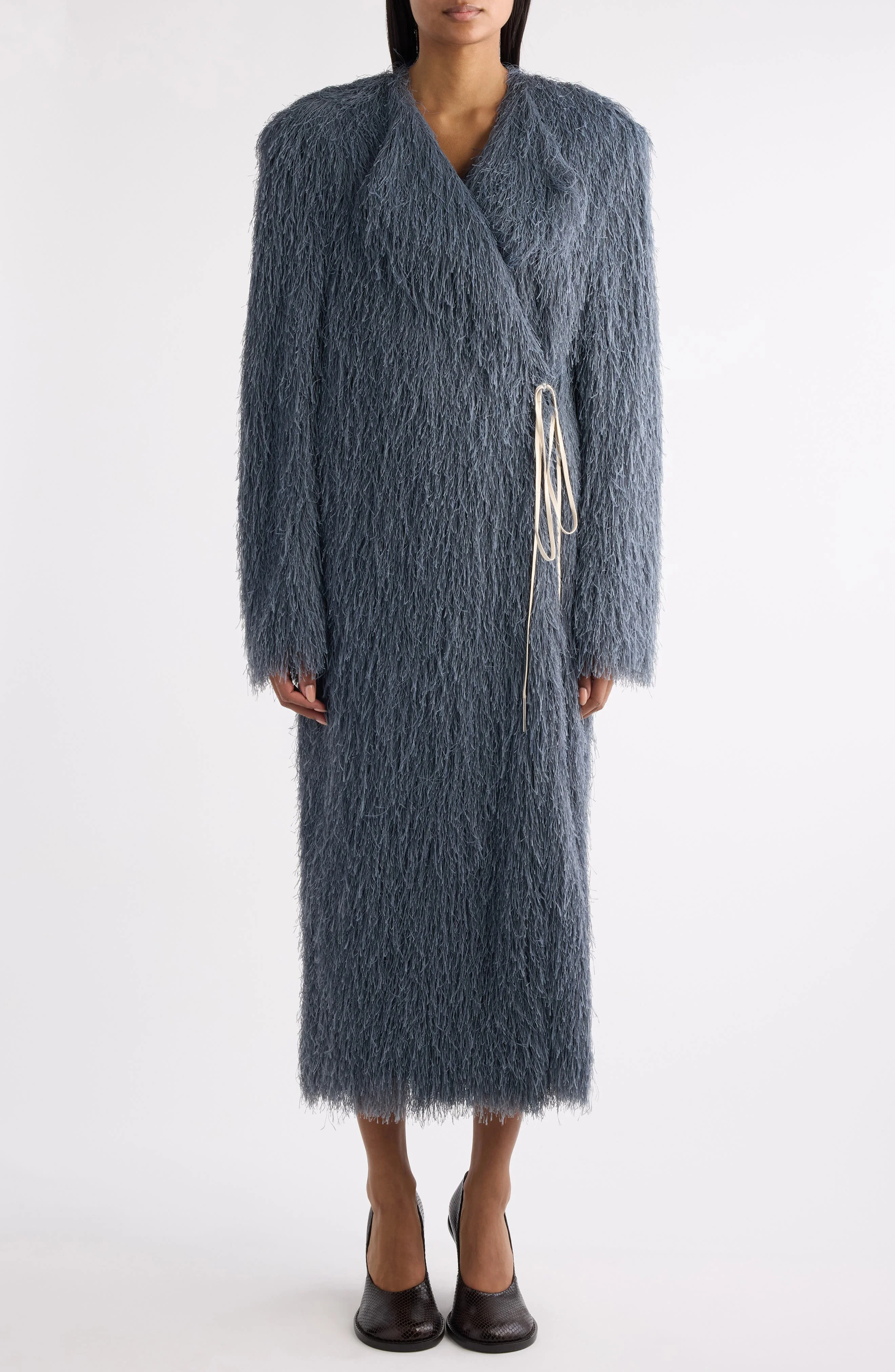 Dries Van Noten Rivla Eyelash Fringe Wrap Coat in Dark Grey at Nordstrom
