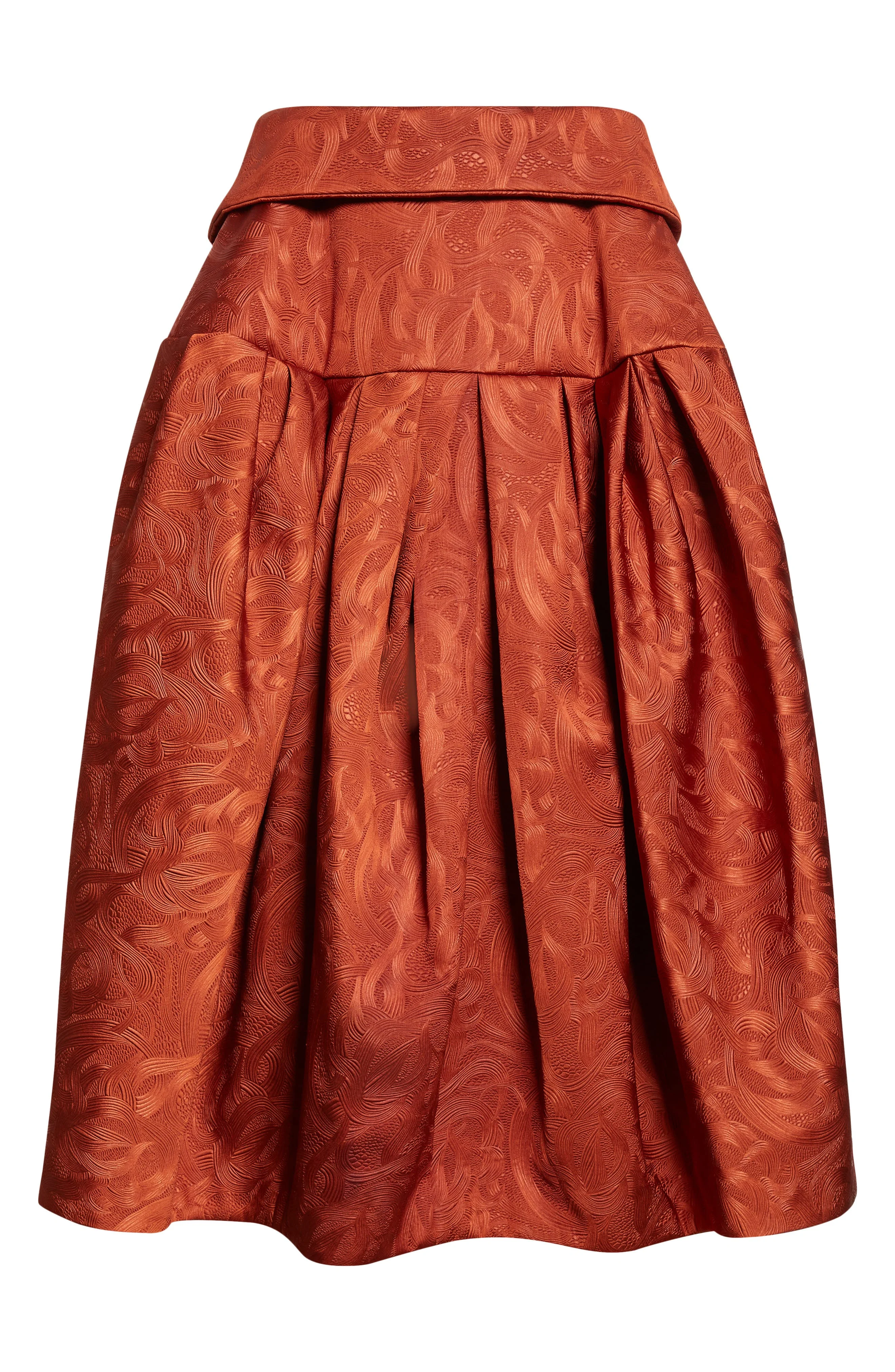 Van Noten successor Julian Klausner continues the iconoclastic Belgian brand's eclectic color/print/texture fusion with this runway-featured midi skirt tailored with a sculptural, folded waistband and voluminous pleats. The swirling embossed jacquard pattern captures the grandeur and glamour of the fall '25 collection. Hidden back-zip closure Side-seam pockets Lined 70% polyamide, 30% polyurethane Dry clean Imported Designer Clothing