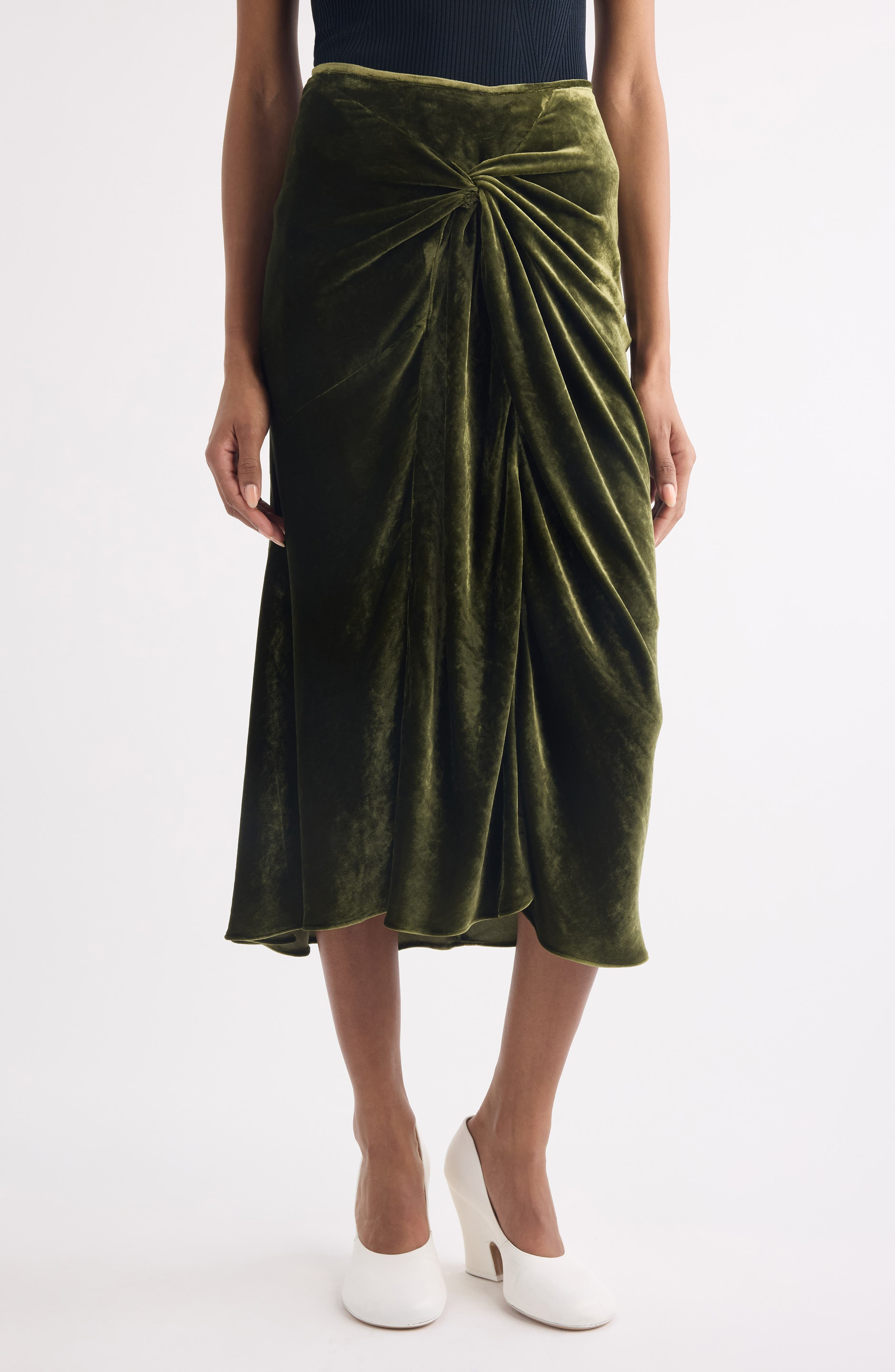 Dries Van Noten Smila Twist Front Velvet Midi Skirt in Khaki at Nordstrom