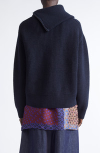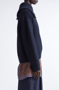 The Belgian label subverts traditional knitwear with a design that feels both conceptual and tactile. Knit from indulgently soft wool yarns, this sweater is crowned with an architectural turtleneck that commands attention. An asymmetric zip slices through the neckline like a glinting afterthought adding an industrial edge to the otherwise sculptural silhouette. Asymmetric half-zip closure Turtleneck Long sleeves Dropped shoulders Ribbed cuffs and hem 100% wool Dry clean or hand wash, dry flat Made in Belgium Designer Clothing