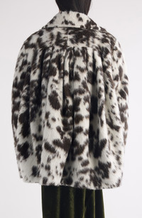 Gathers at the back bring the label's signature volume to this runway-featured jacket made of fuzzy faux fur in a tonal cow print. Double-breasted button closure Notched lapels Chest welt pockets; front flap pockets Lined 51% wool, 19% polyester, 15% acrylic, 12% alpaca, 3% polyamide Dry clean Imported Designer Clothing