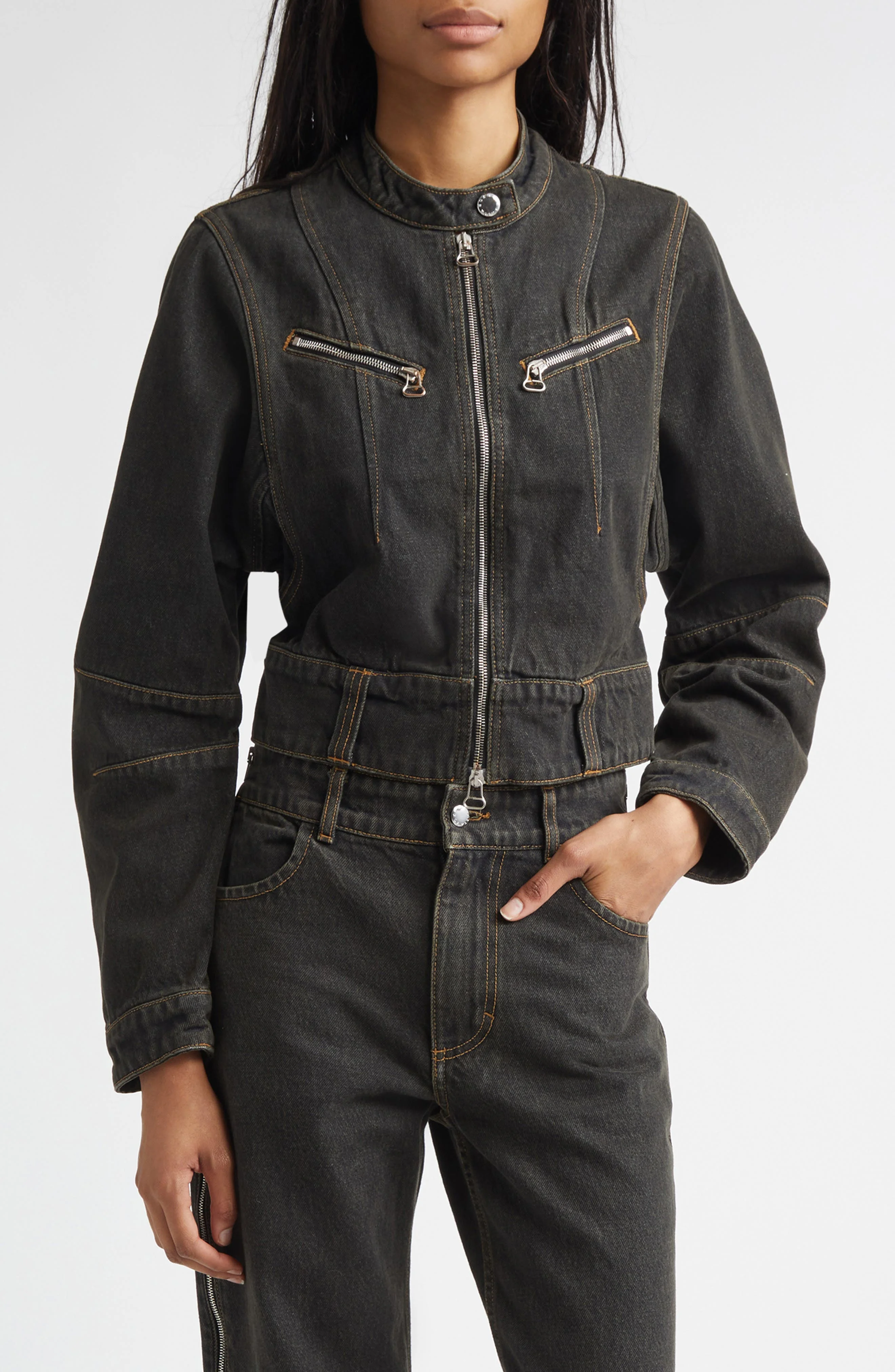 Straight from the spring '26 runway, this zipped-up denim jacket is cut with narrowed shoulders and curved barrel sleeves for an unconventional aesthetic. Two-way front-zip closure Band collar with snap closure Chest zip pockets 100% cotton Dry clean or machine wash, line dry Made in the USA Designer Clothing