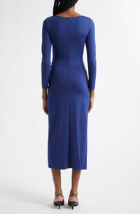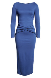 A gathered-and-twisted waistline brings texture and eye-catching appeal to this sleek maxi made from soft stretch-jersey fabric for a body-contouring silhouette. Hidden back-zip closure Bateau neck Long sleeves 77% viscose, 17% polyamide, 6% elastane Dry clean Imported