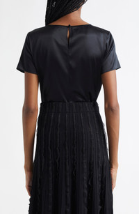 Elevate your desk-to-dinner vibe in this staple satin T-shirt crafted from luxurious stretch silk. Back keyhole with button-and-loop closure Crewneck Short sleeves 94% silk, 6% elastane Dry clean Imported