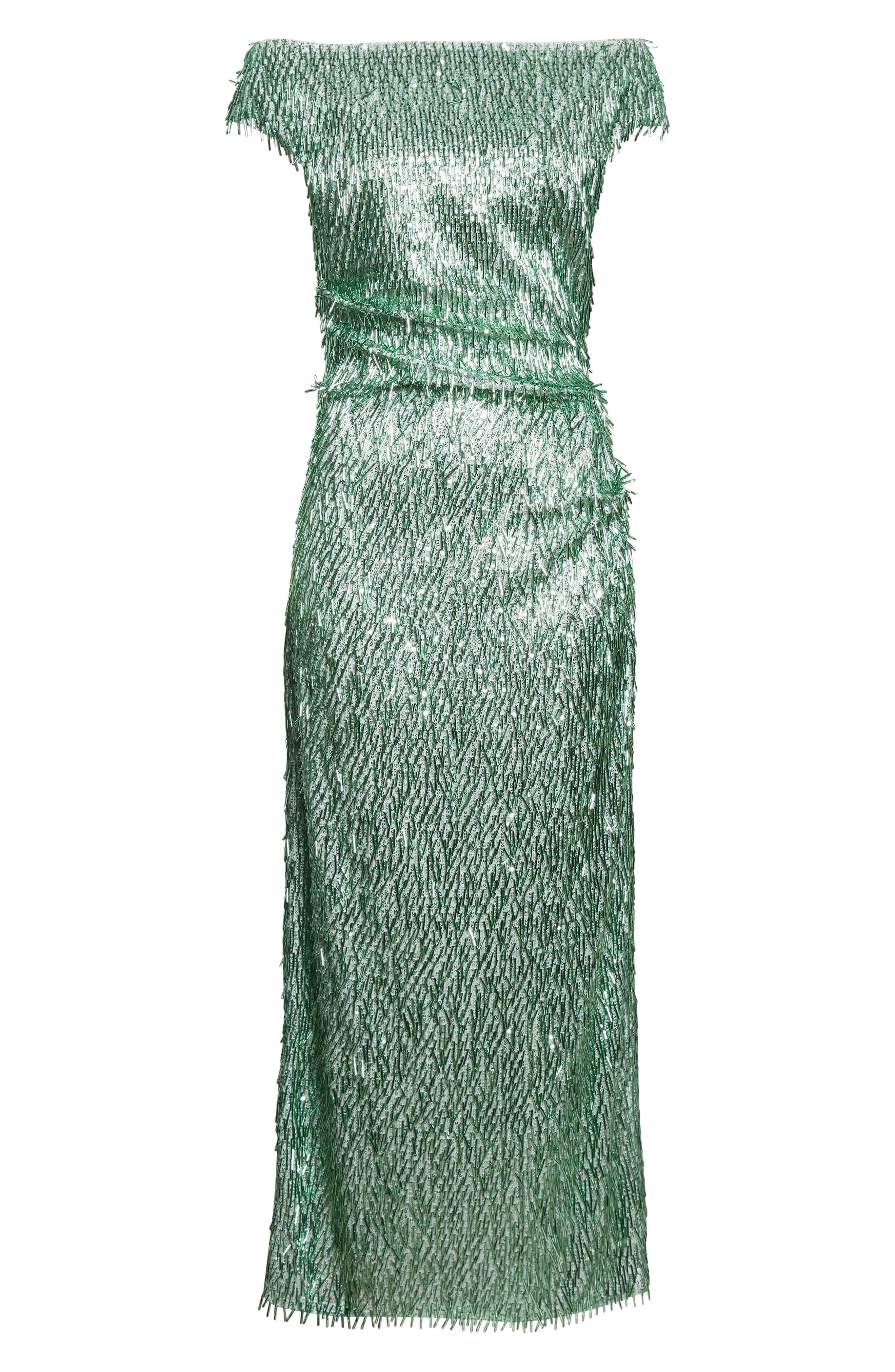 Crafted in collaboration with artist Kaye Donachie, this beautifully beaded dress offers an infusion of textured elegance in a spearmint-inspired palette. Off-the-shoulder neck Cap sleeves Back vent Lined 95% polyester, 5% spandex Dry clean Made in the UK Designer Clothing