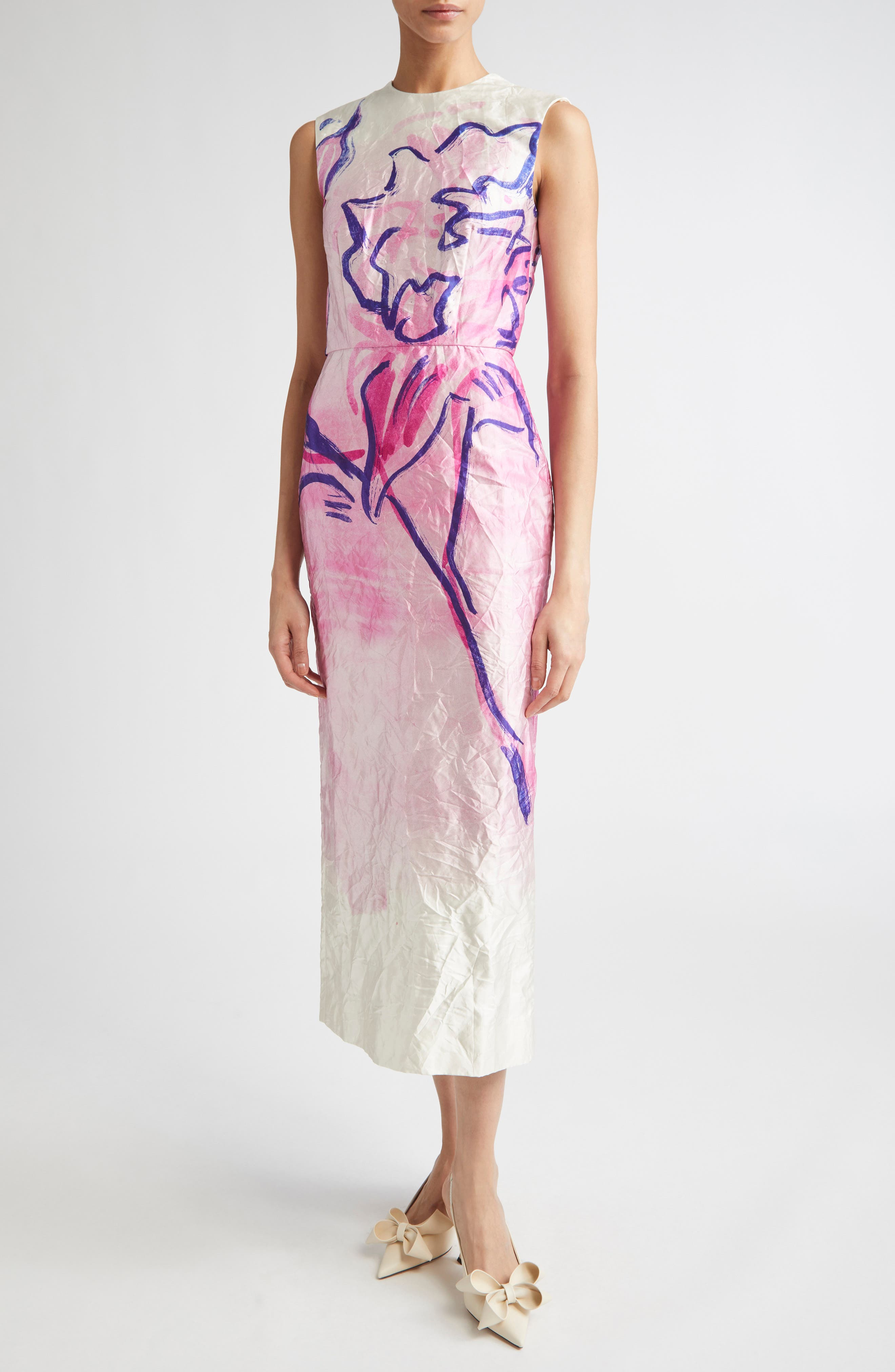 Be a walking work of art in this lookbook-featured sheath dress with an exquisite hand-drawn rose set against a crinkled satin canvas, evoking the dream-like quality of artist Kaye Donachie's expressionist brushstrokes in wearable form. After commissioning a portrait of his late mother, Erdem Moralıoğlu partnered with Donachie for pre-fall '25, translating the painter's palette into ethereal prints and rich fabrics. Hidden back-zip closure Jewel neck Sleeveless Back vent Silk lining 94% polyester, 6% metallic fibers Dry clean Made in Portugal Designer Clothing
