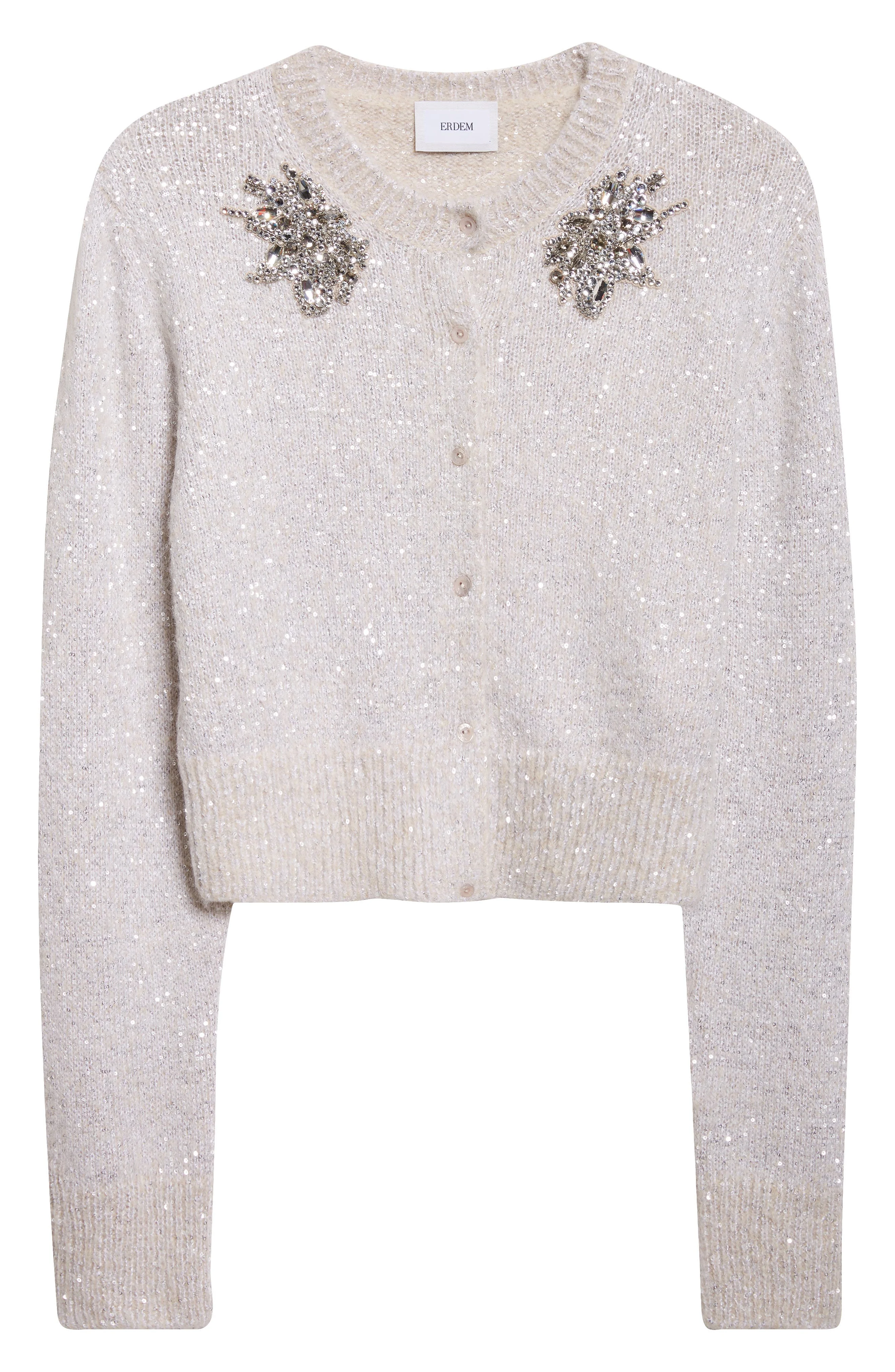 Designed to dazzle in motion, this airy alpaca‑blend cropped cardigan shimmers with allover sequins that give the fabric a soft‑focus halo. Crystal flourishes concentrate the glow at the collarbone. Front button closure Crewneck Long sleeves Ribbed cuffs and hem 70% alpaca, 30% polyamide Dry clean Imported Designer Clothing