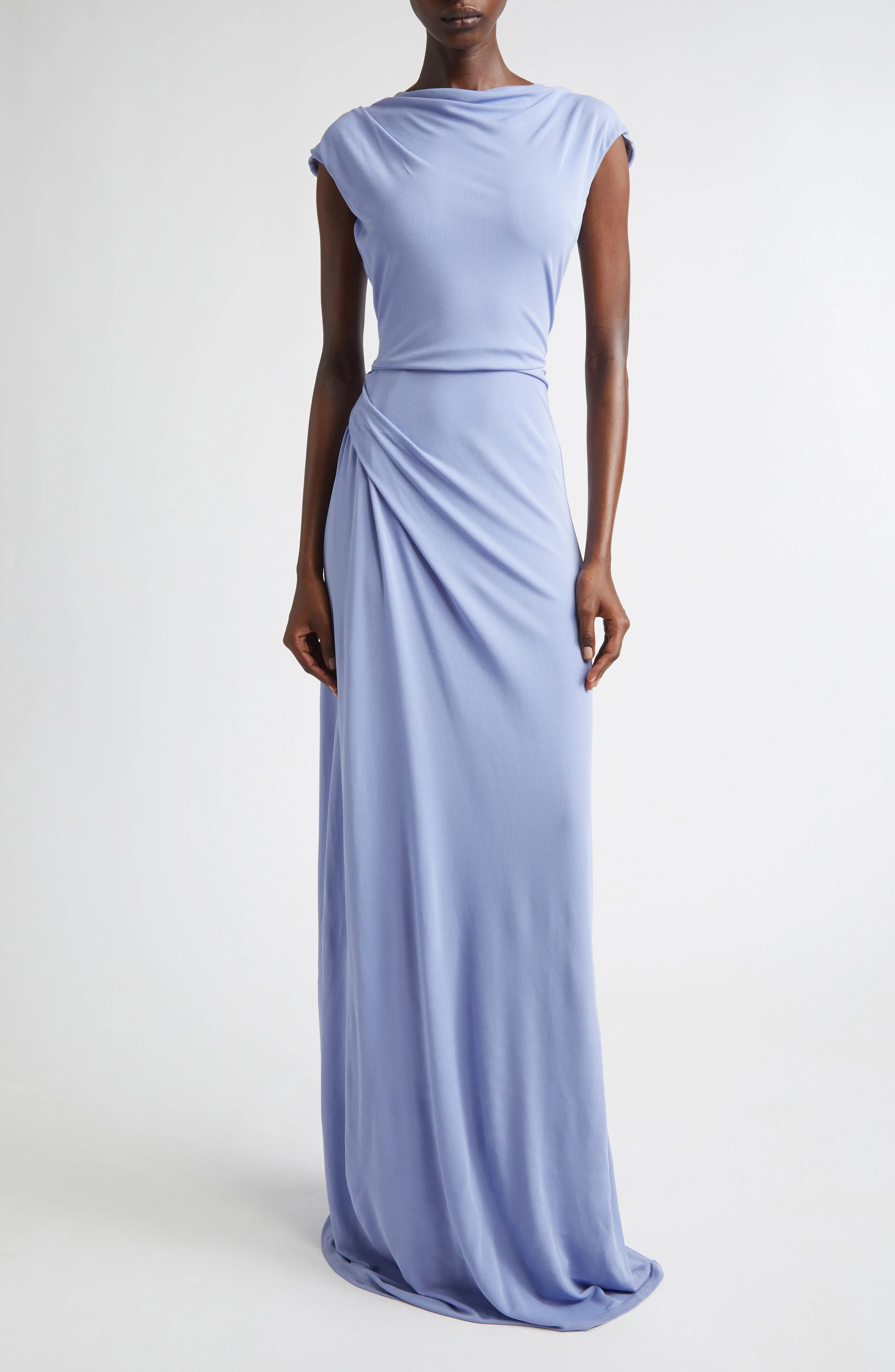 Exude a blend of strength and delicate beauty in the drapey, statuesque romance of this jersey gown that has a poetic vibe in the way it flows over your curves. Hidden back-zip closure Draped neck Cap sleeves 100% viscose Dry clean Made in Portugal Designer Clothing