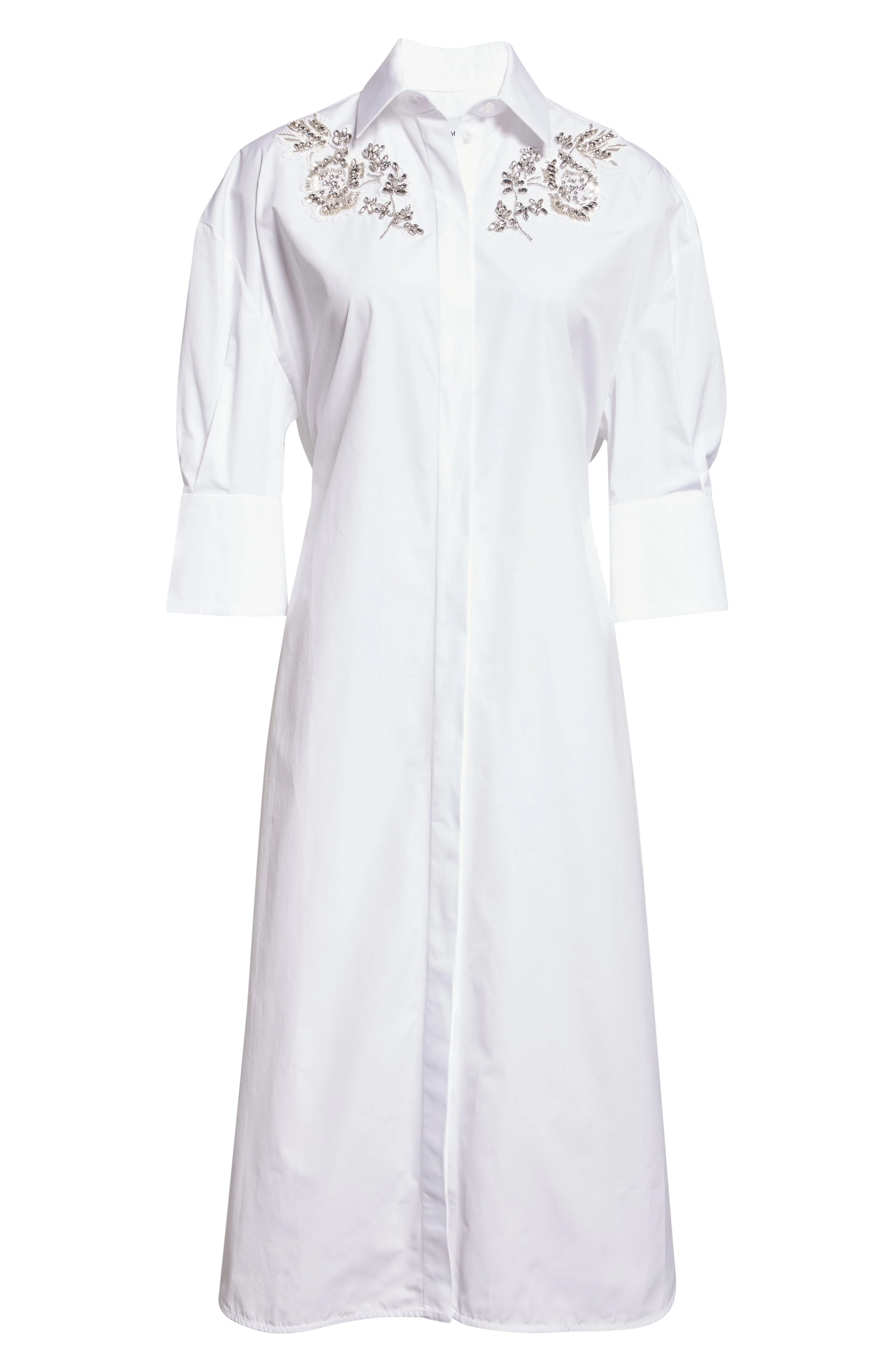 For pre-spring '26, Erdem takes inspiration from Maria Sibylla Merian—the 17th-century German entomologist and botanical illustrator—transforming a classic midi shirtdress into a sparkling stunner with crystal-sparked floral accents at the shoulders. Hidden-button placket Spread collar Elbow-length sleeves with button cuffs Side slits Unlined 100% cotton Dry clean Made in Poland Designer Clothing