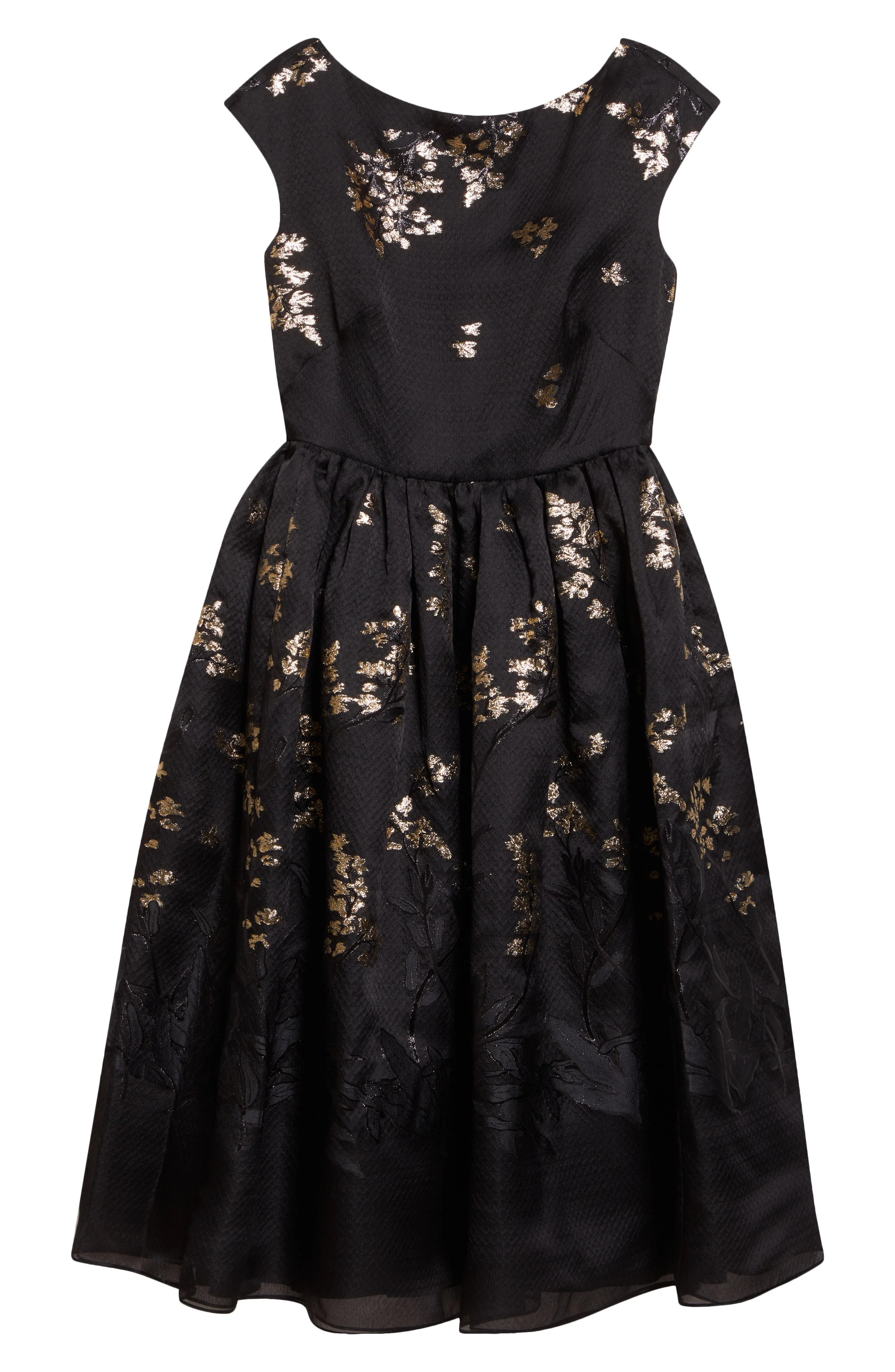 An elegant interplay of texture and tone, silhouette and shine, this fit-and-flare dress captures the shape and grace of mid-century fashion in metallic-detailed silk-blend brocade. Hidden back-zip closure Bateau neck Cap sleeves Silk lining 82% silk, 8% polyester, 5% polyamide, 5% metallic fibers Dry clean Made in Portugal Designer Clothing