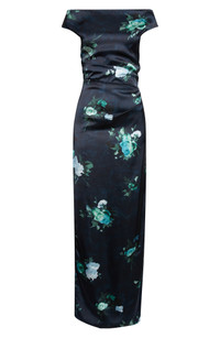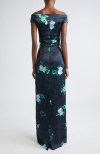 Artfully ruched and draped, this elegant gown designed in a slim, off-the-shoulder silhouette ending with flared skirt is sewn from duchesse satin in a painterly floral print. Hidden back-zip closure Off-the-shoulder neck Cap sleeves Back vent Lined 100% viscose Dry clean Imported Designer Clothing