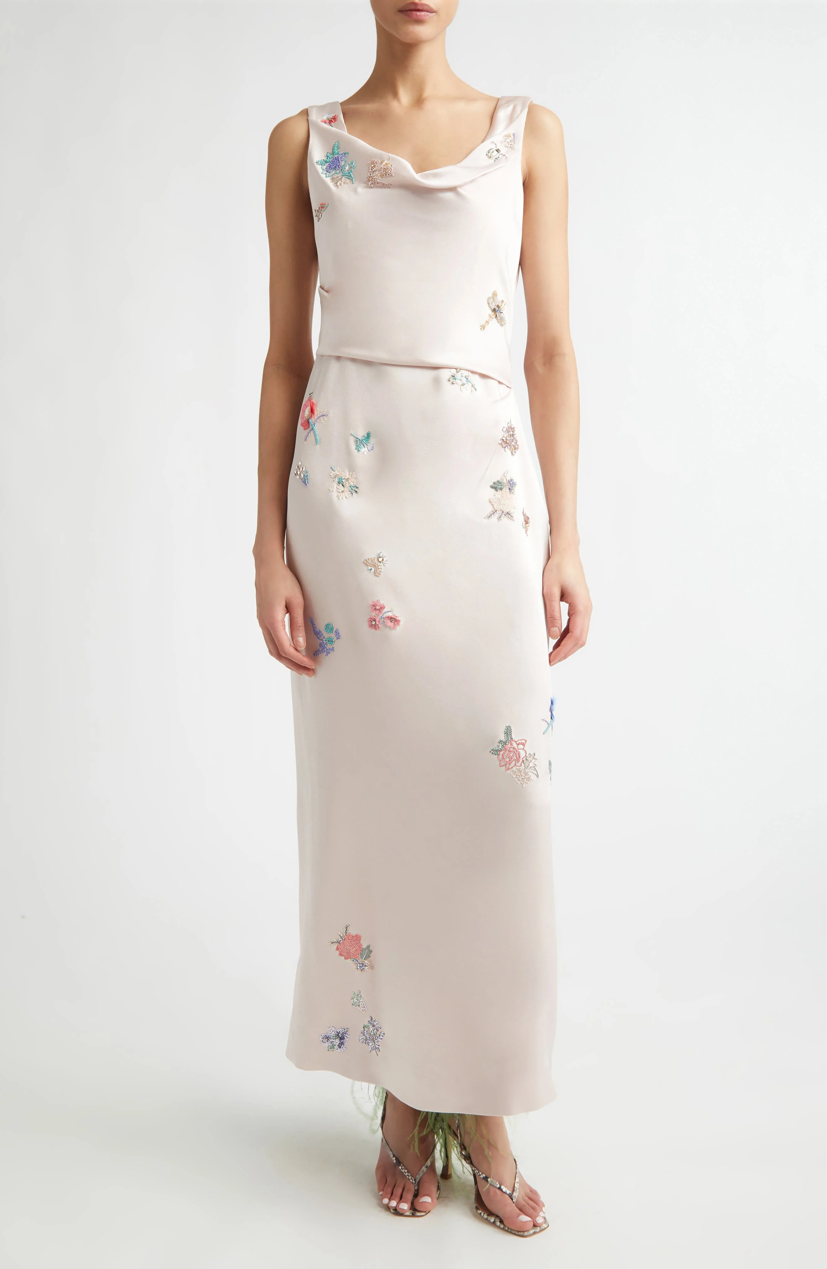 Erdem Moralıoğlu reimagines the intricate studies of German entomologist and illustrator Maria Sibylla Merian as wearable art in this elegantly draped cocktail dress, where fluid cady becomes a canvas for sequined insects and flowers inspired by the naturalist's botanical etchings. Hidden back-zip closure Cowl neck Sleeveless Back slit Silk lining 71% acetate, 28% viscose Dry clean Made in the UK Designer Clothing