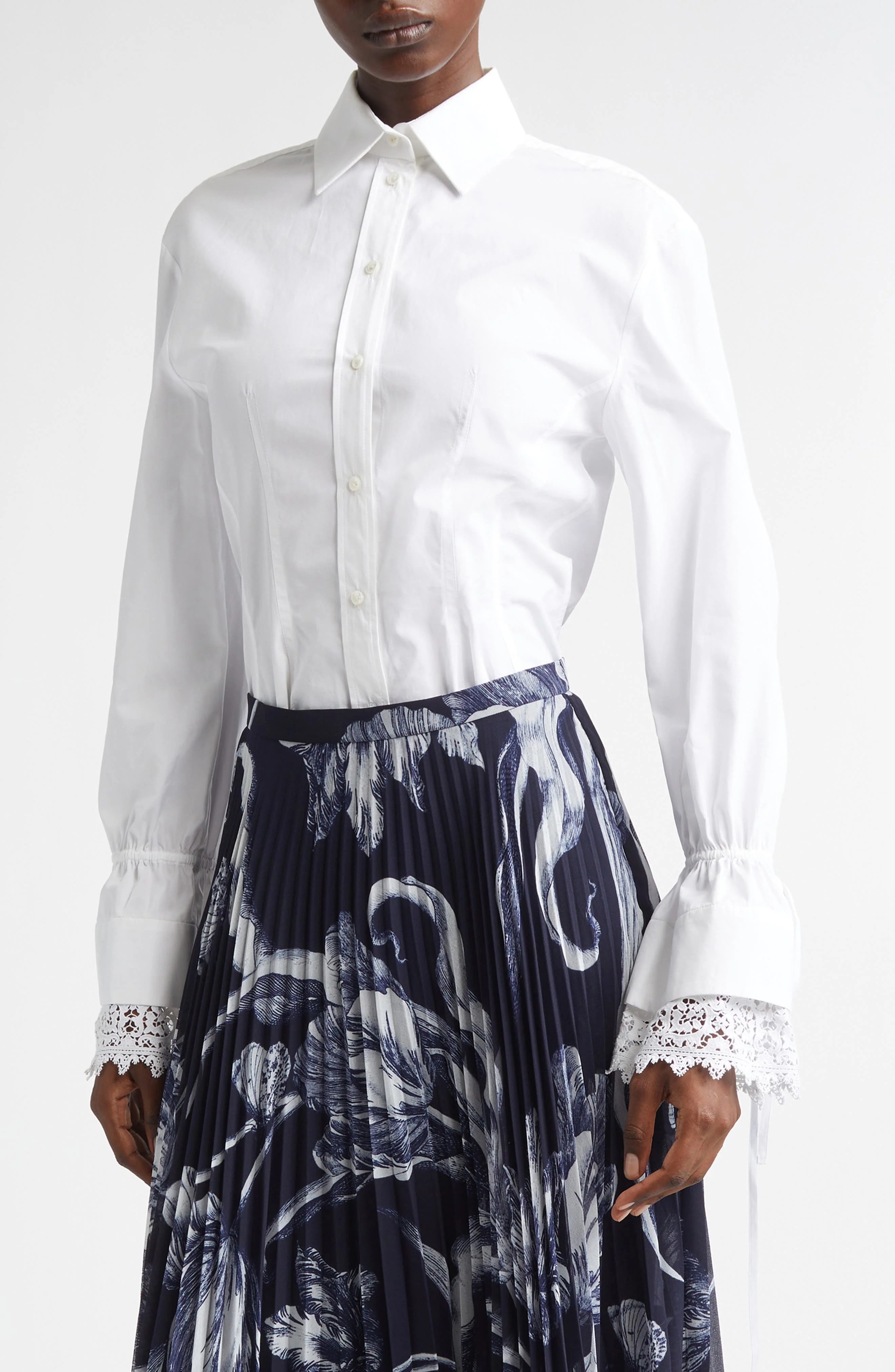 Lace-trimmed flared cuffs topped with ribbon drawstrings bring romantic allure to this cotton button-up shaped in a figure-hugging fit via expertly placed darting. Front button closure Spread collar Long sleeves with button cuffs 100% cotton Dry clean Imported Designer Clothing