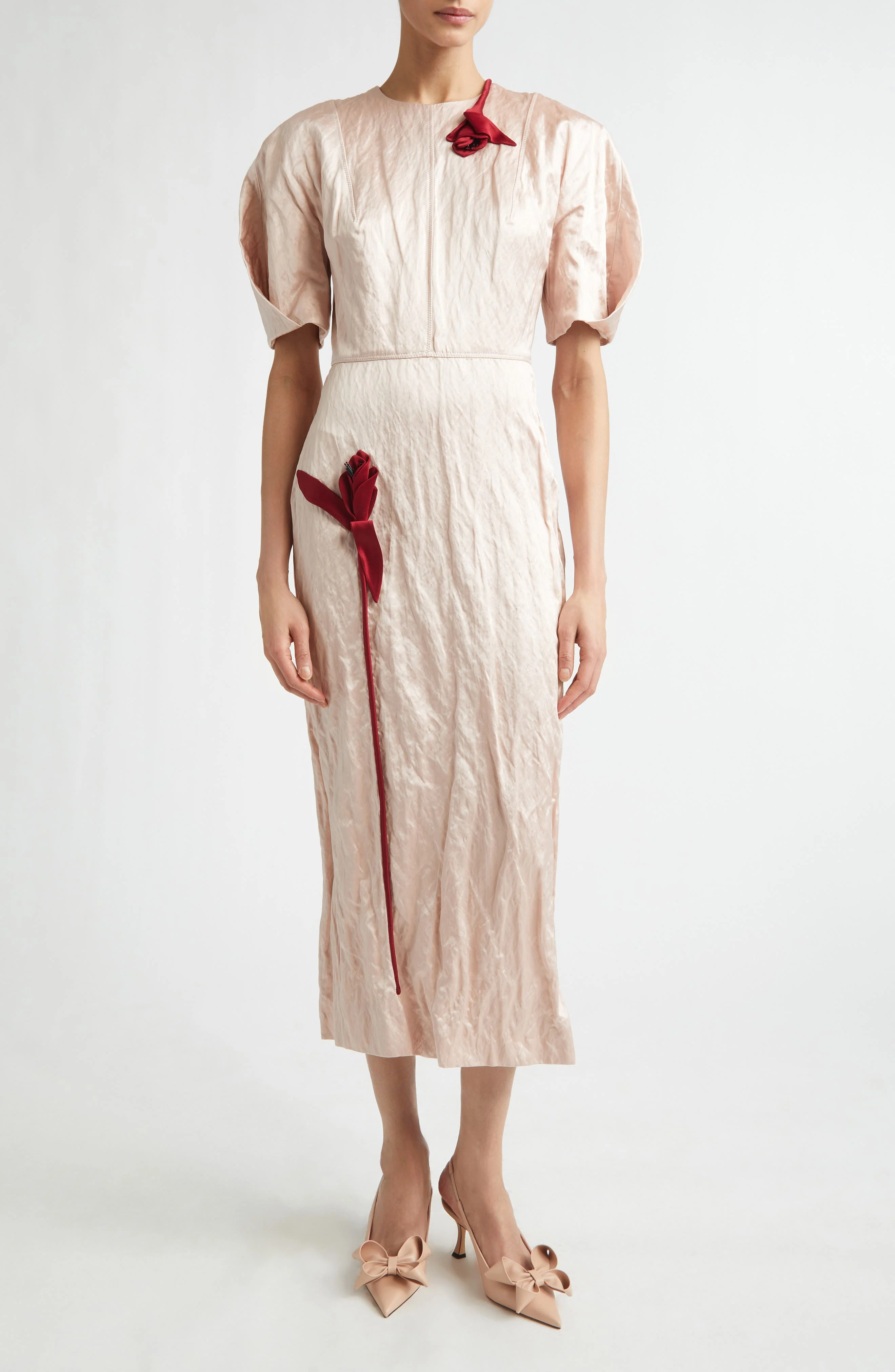 EMBROIDERED TEXTURED SATIN MIDI DRESS