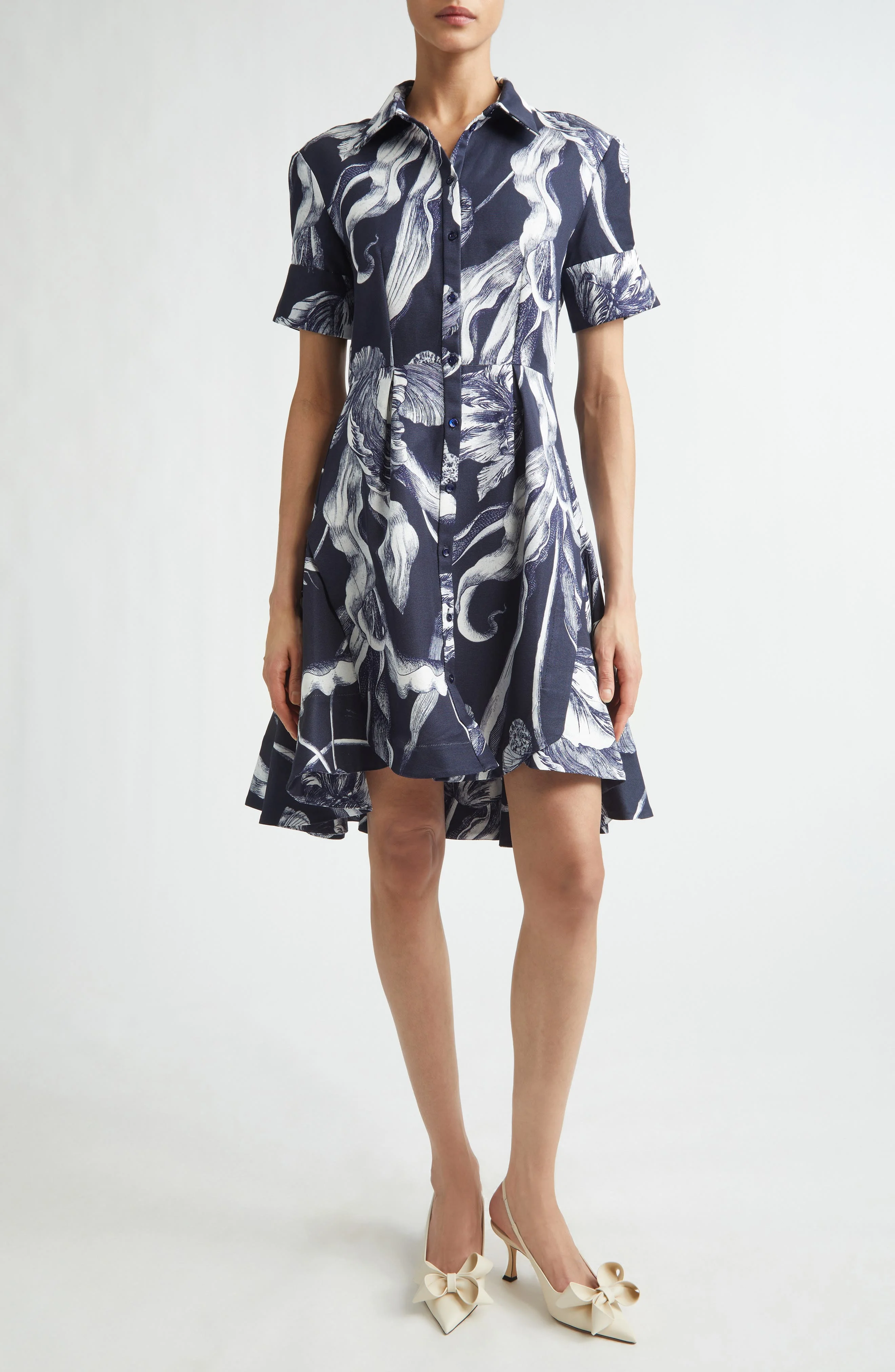 Erdem Moralıoğlu reimagines the intricate studies of German entomologist and illustrator Maria Sibylla Merian as wearable art in this pleated shirtdress, where crisp faille becomes a canvas for an engraving-style tulip print inspired by the naturalist's botanical etchings. Front button closure Spread collar Short sleeves 66% cotton, 34% viscose Dry clean Made in Portugal Designer Clothing