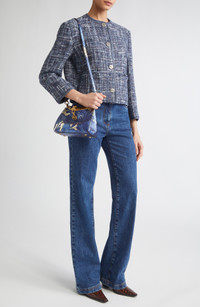Signature paisley takes a supporting role as the colorful lining on this boxy, foreshortened jacket in an abstractly checked nubby boucle. Front button closure Jewel neck Three-quarter sleeves Front patch pockets Paisley lining 68% cotton, 15% wool, 15% viscose, 2% polyamide Dry clean Made in Italy Designer Clothing